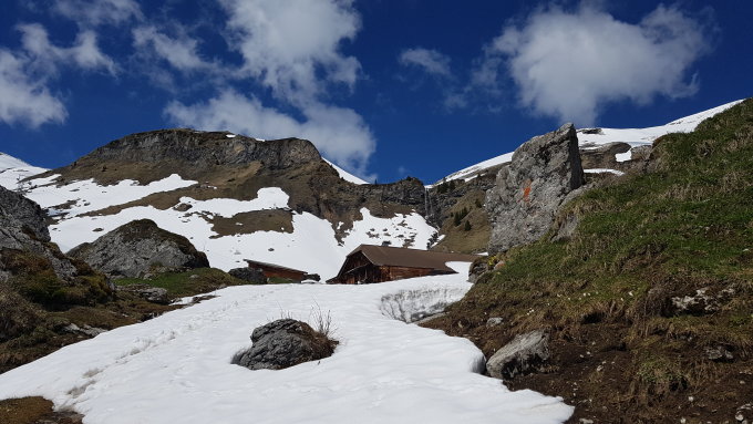 Die ersten, zum Teil sehr dicken Schneefelder auf dem Weg beginnen ab 1600m. Der Schnee ist aber überall gut tragend und problemlos begehbar. Mehrheitlich kann mach aber auf aperem Weg gehen. Ab Gruebi dann viele blühende Enzianen und andere Bergfrühlingsblumen.