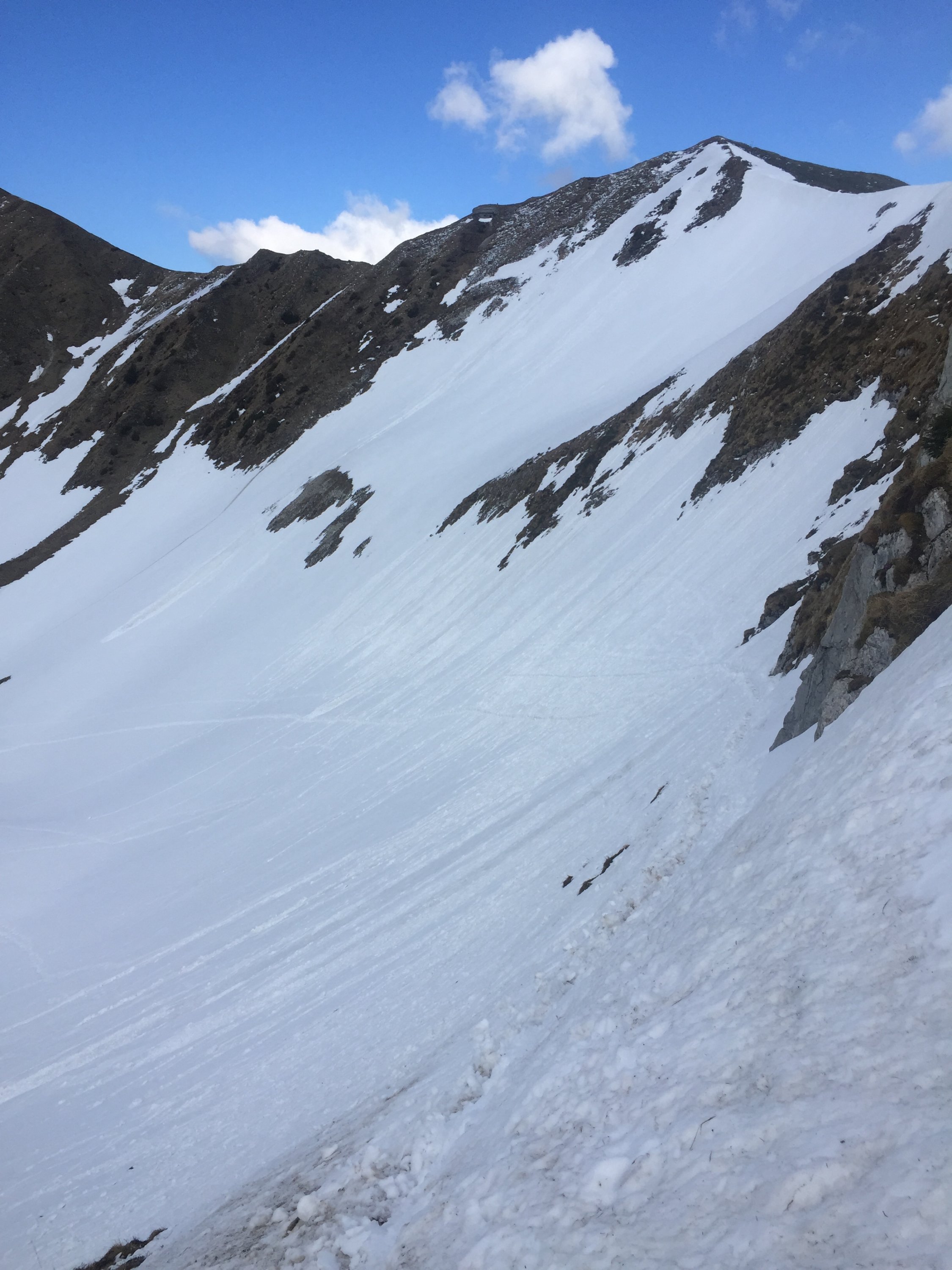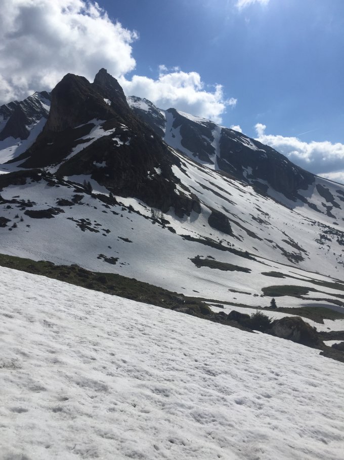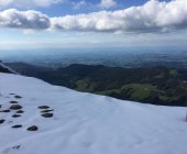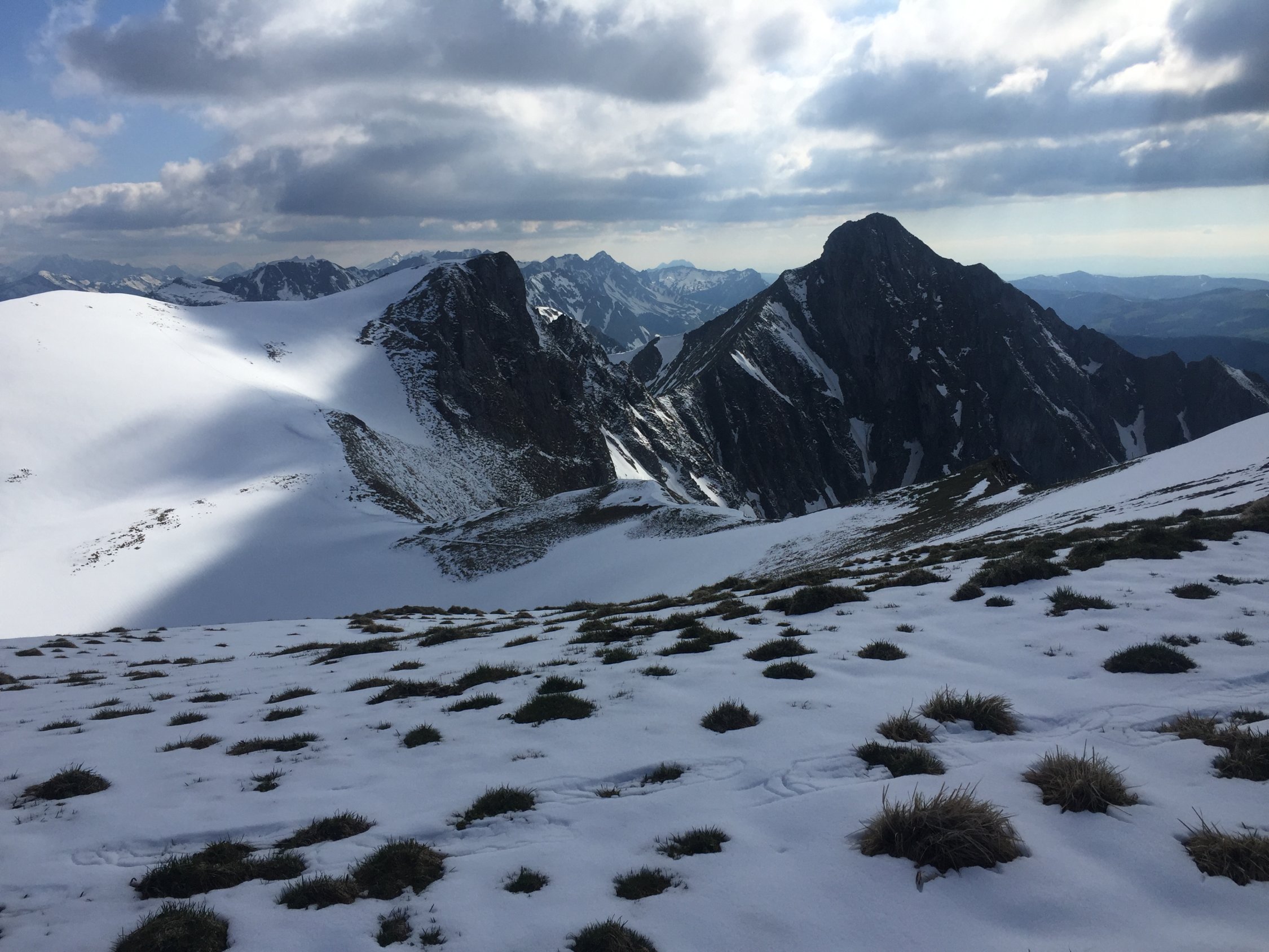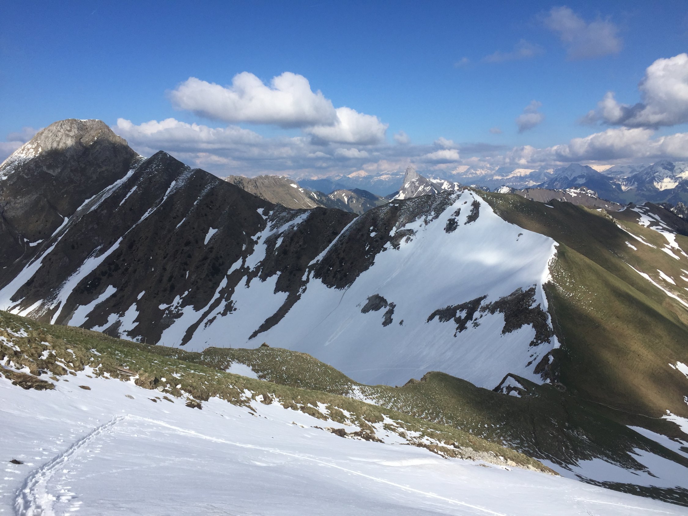 Abend-Tour Start PP Untere Gantrischhütte 17:00h. Ski tragen bis Abzweigung Obere Gantrischhütte Pt.1615, ab hier noch durchgehend Schnee bis Morgetepass. Ab hier aper und Schneefelder im Wechsel bis auf den Südgrat.