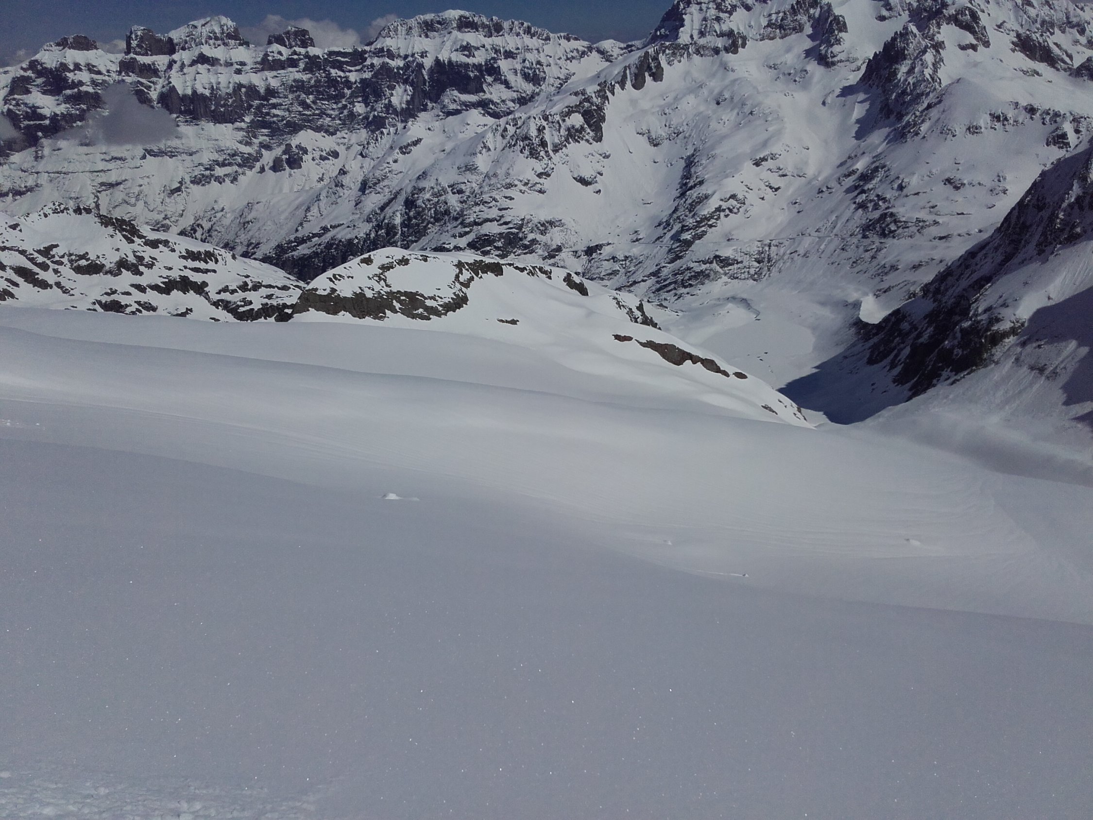 Perfekte Aufstiegsspur, Pulverschnee bis zum ersten Bruch, wir sind um etwa 10:00 Uhr vom Gipfel los gefahren. Das reste Mal in etwa direkter Linie zum ersten Bruch runter.