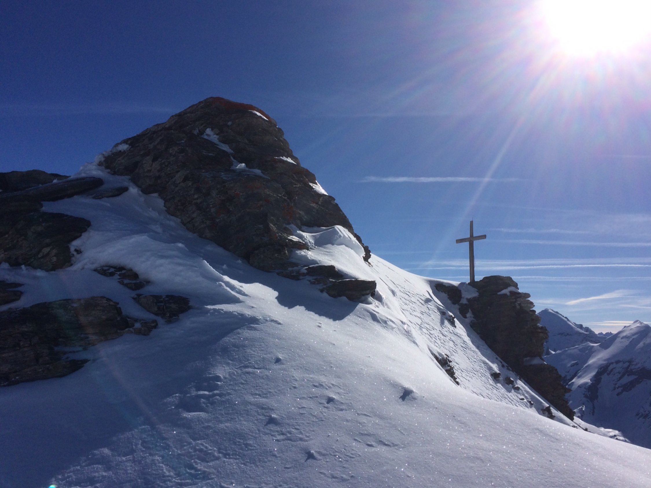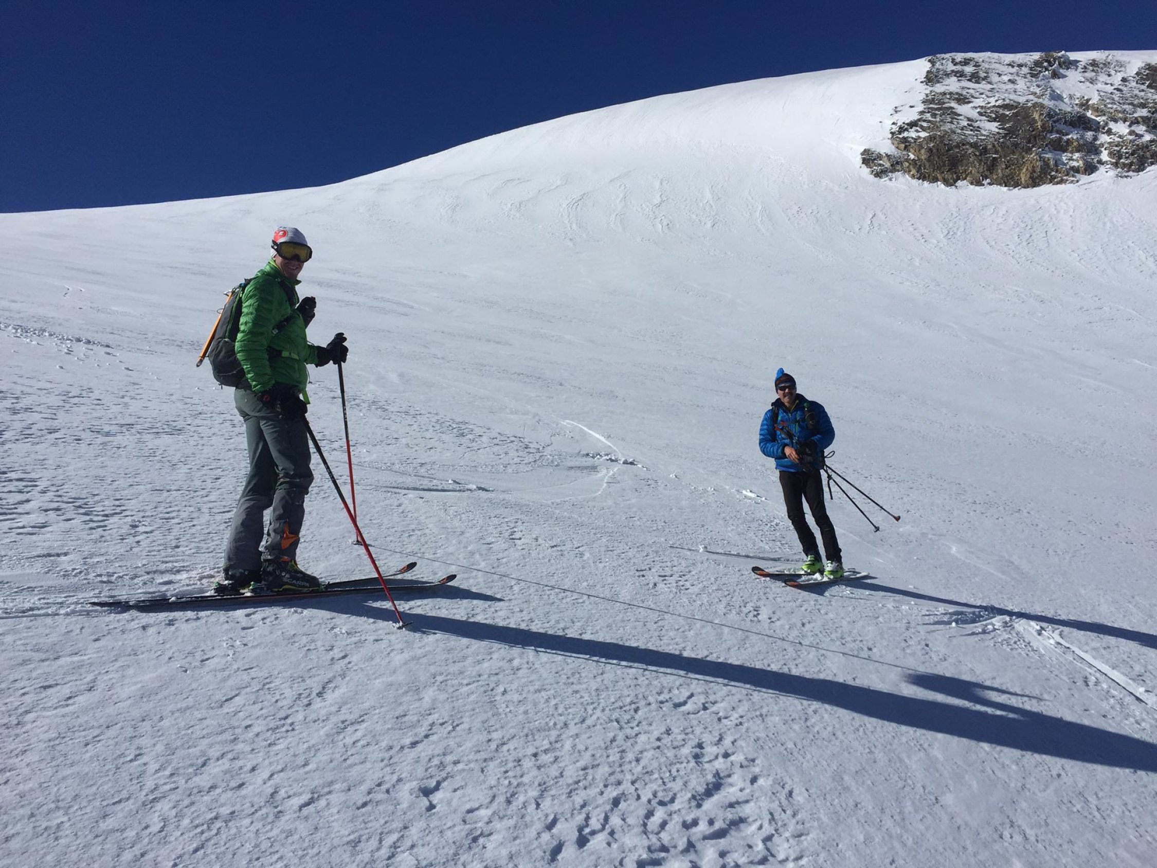 Von dort folgt man der Normalroute über den Frühstücksplatz bis zum Gipfel. Frühstücksplatz erfordert etwas Routine, ist aber gut zu machen. Die letzten 20 Meter, bis zur Kante sind wir zu Fuss gegangen! Nach dem Frühstücksplatz wider gute Verhältnisse ! Abfahrt heute 9.15 perfekt!