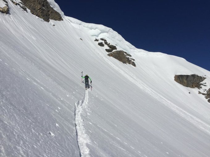 Von dort folgt man der Normalroute über den Frühstücksplatz bis zum Gipfel. Frühstücksplatz erfordert etwas Routine, ist aber gut zu machen. Die letzten 20 Meter, bis zur Kante sind wir zu Fuss gegangen! Nach dem Frühstücksplatz wider gute Verhältnisse ! Abfahrt heute 9.15 perfekt!