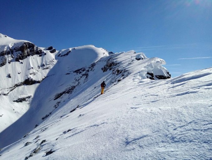 Aufstieg: Aufstieg zum Zackengrat problemlos, Zackengrat hat Hartschnee, aber vollständig mit Skis (Hartsteisen!) machbar (Aufpassen Wächten sind dieses Jahr gross). Die Schlüsselstelle am Ende des Zackengrats ist mit Schnee vollgeweht und problemlos, einfach abrutschen. Uebergang zum Hauptgipfel ist zurzeit mit Skis machbar.