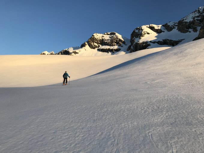Abfahrt vom Skidepot 9:00 Uhr, heute perfekt, gleich der erste Südhang super Butterfirn, blieb gut, ab ca 2300 m dann gut zu fahrender weicher Schnee bis Schneende auf 1990 m.