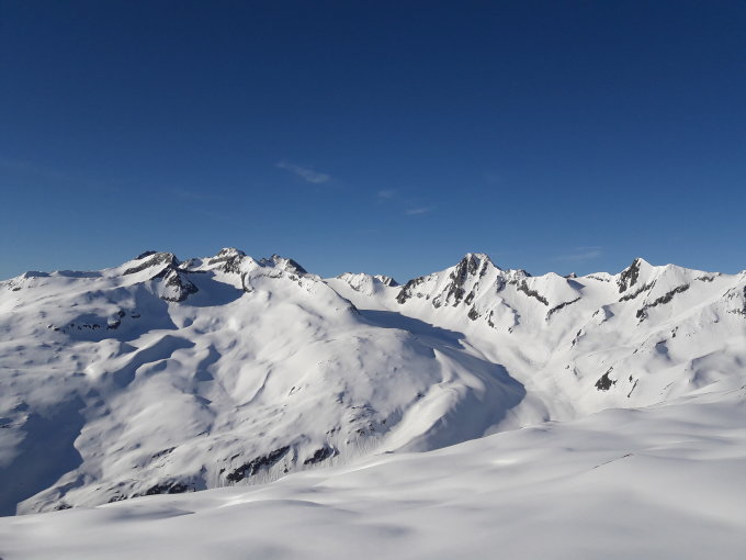 Ab der Strasse in Witenwasserental (nur mit Bewilligung der Alpgenossenschaft und erst bis Schweig geräumt) ca. 65 Höhenmeter die Skies tragen bis eine geschlossene Schneeschicht das Schieben ermöglicht. Unten ca. 100 Hm Büsserschnee und danach top Firn Bedingungen bis zum Gipfel.