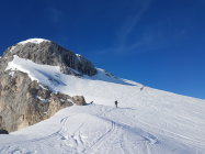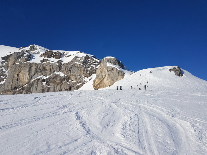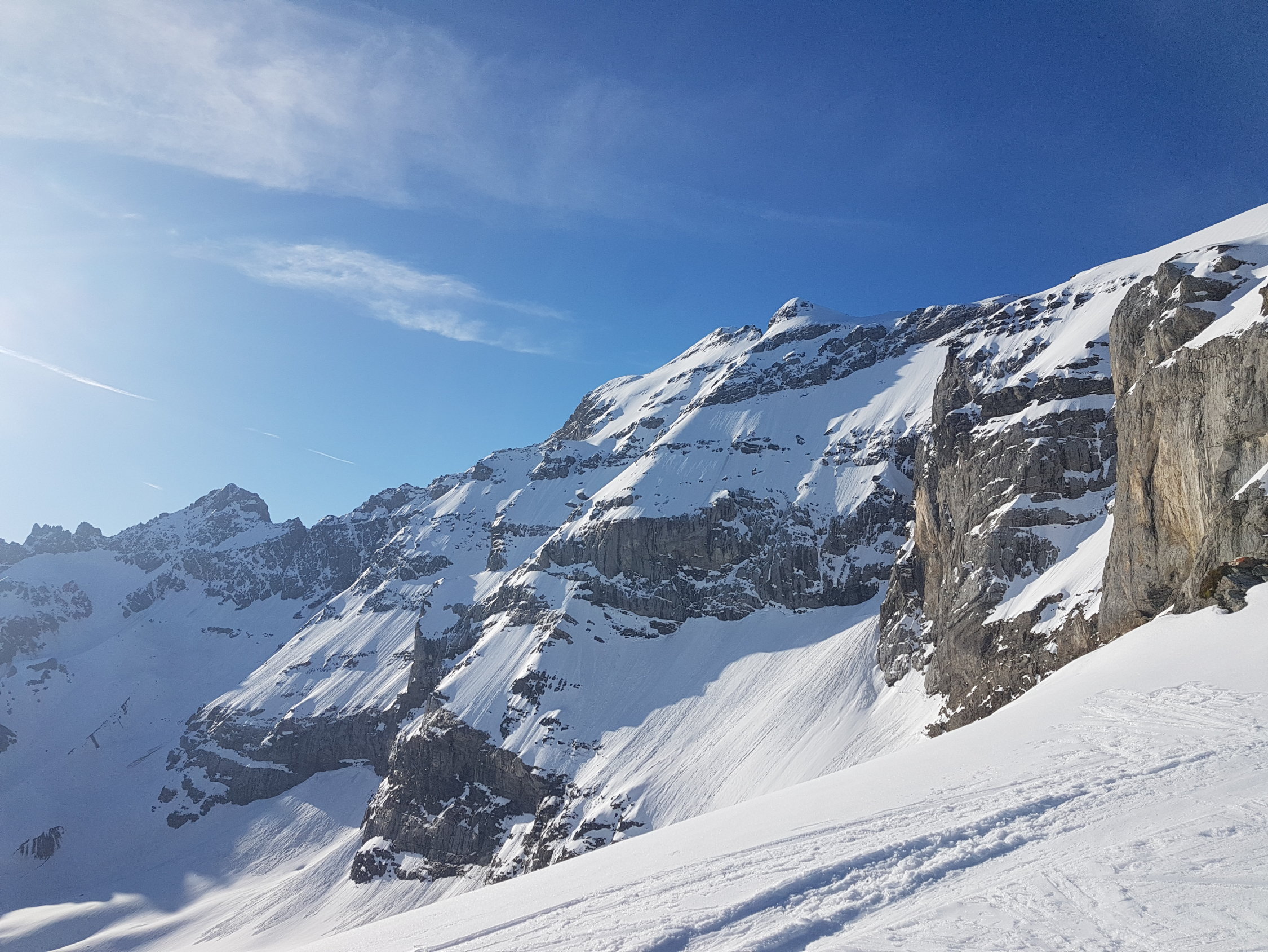 Schnee morgen am Klausenpass nicht perfekt gefroren, was aber für den Aufstieg absolut kein Problem ist. Sehr gute Geher schaffen den Aufstieg zum Iswändli ohne Harscheisen, für alle anderen sind die Steilstufen einfacher mit Harscheisen zu bewältigen.