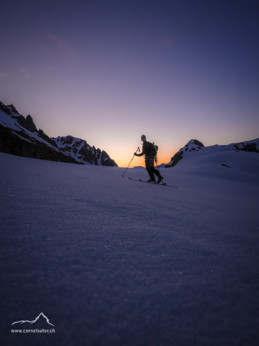 Um ca 9:15 Uhr erreichen die ersten Sonnenstrahlen das Couloir ganz oben beim Sattel, um diese Zeit sollte man wieder bereits unten beim Skidepot sein.