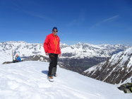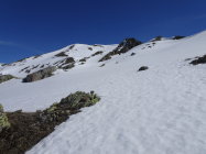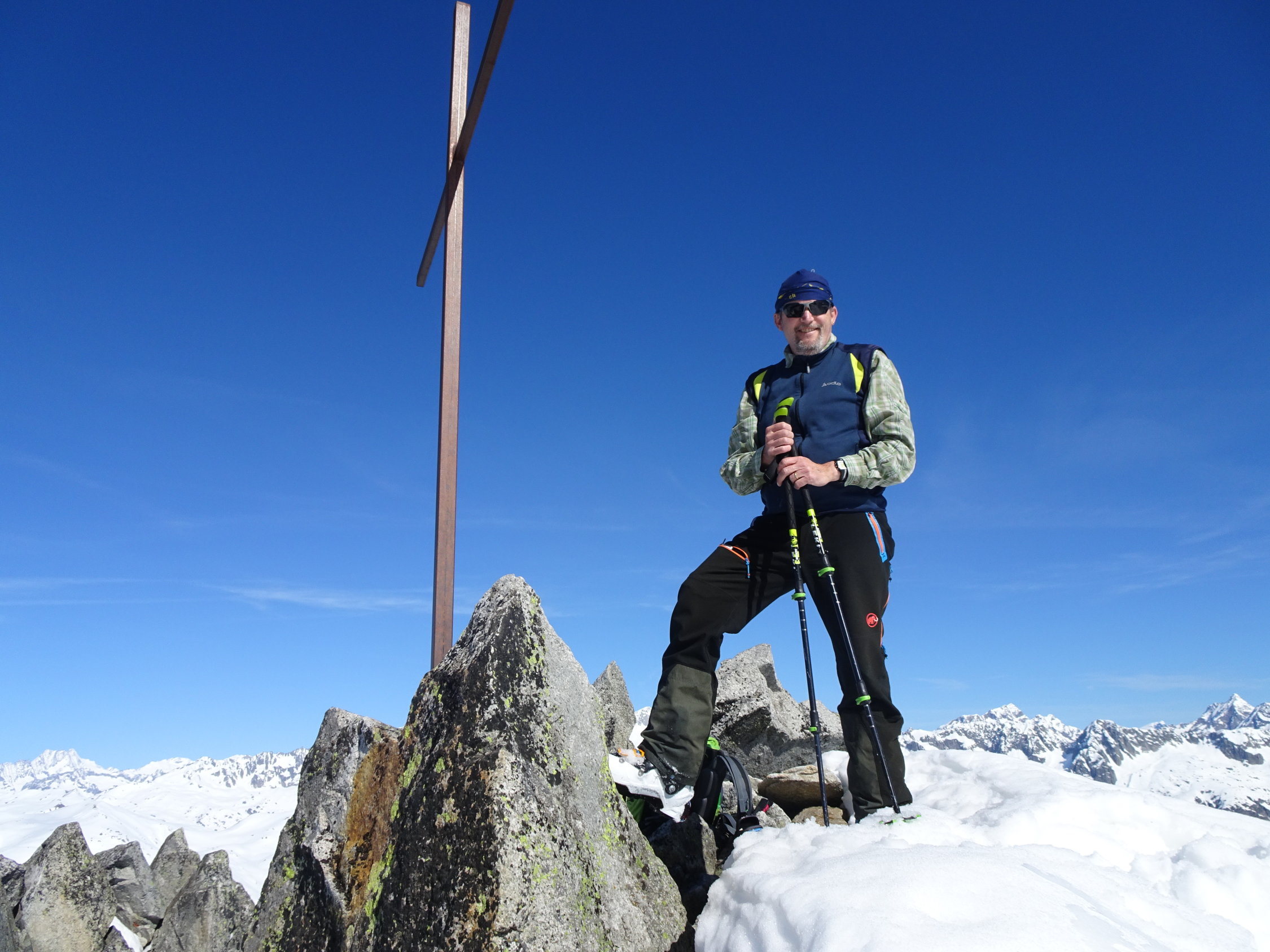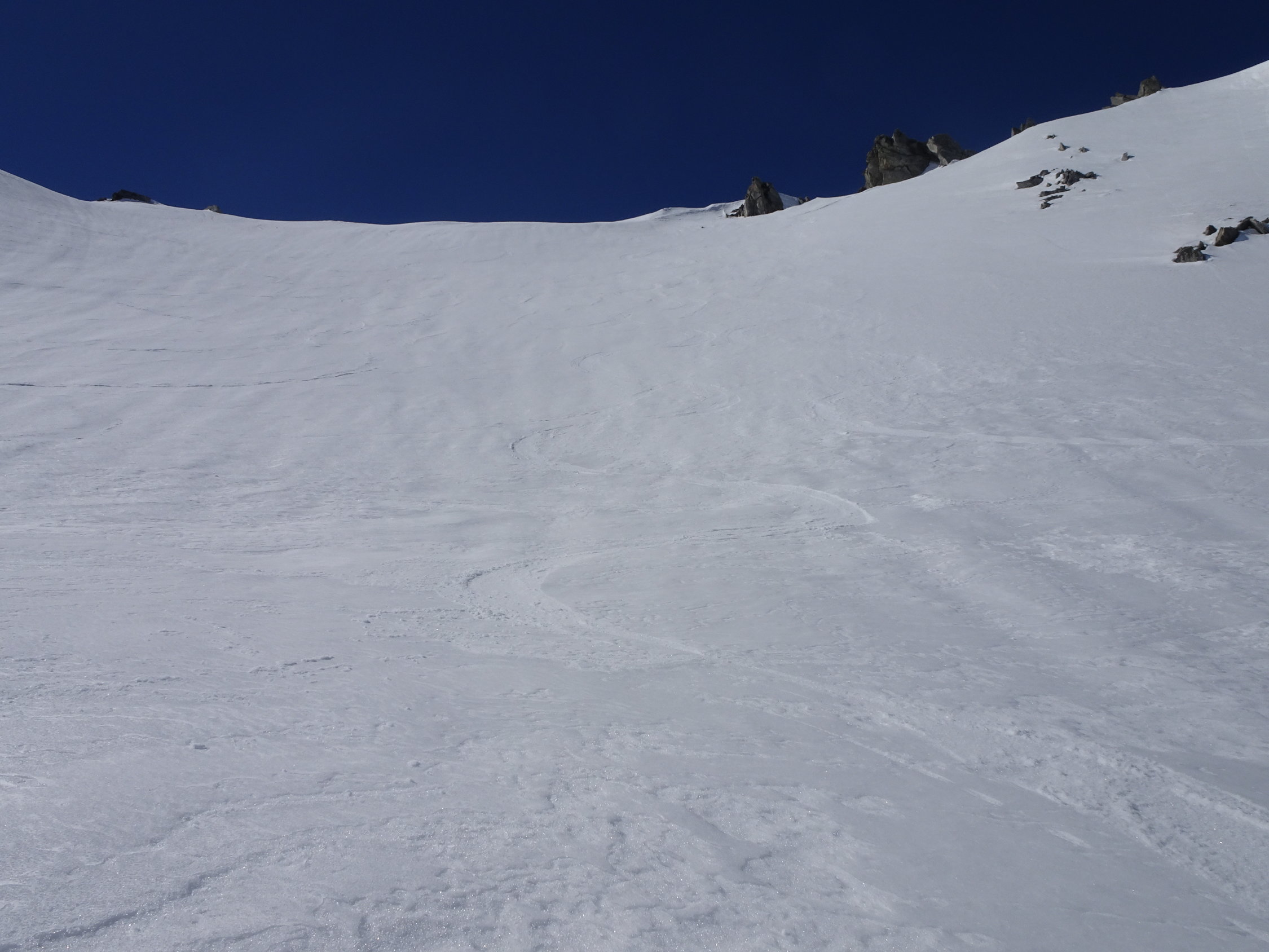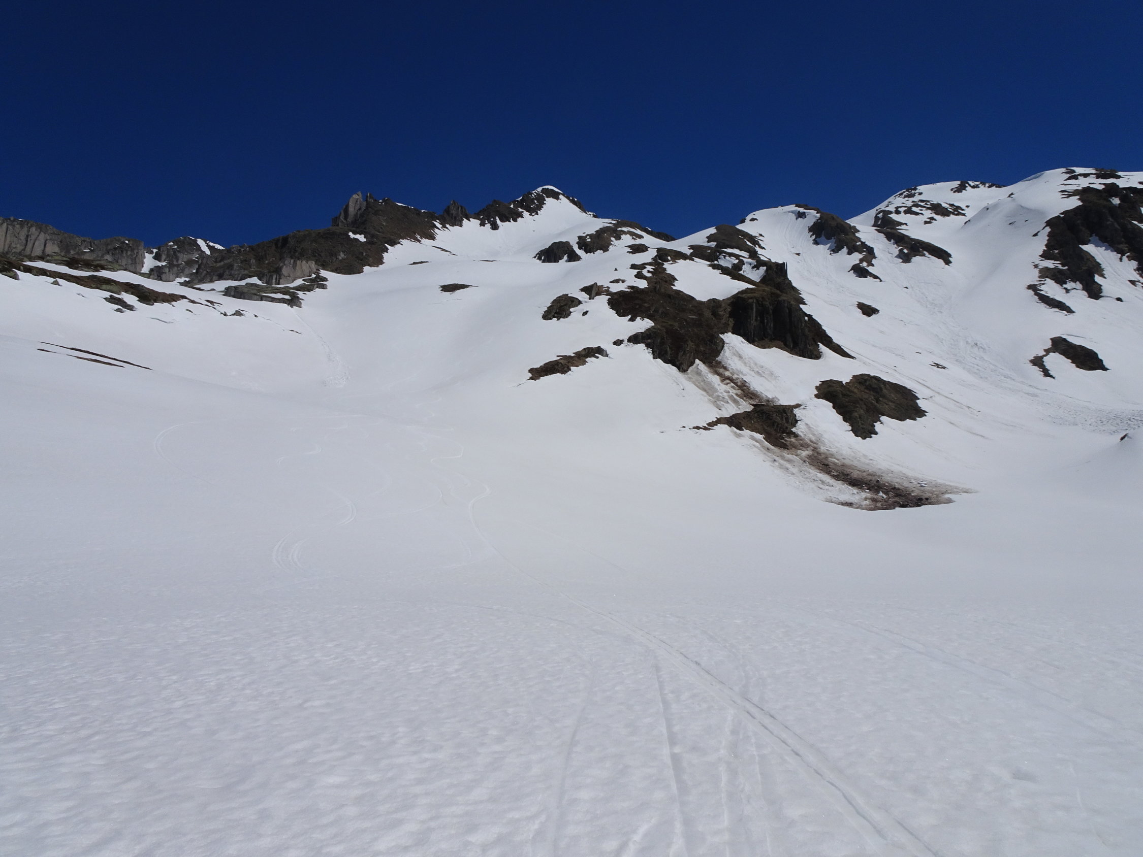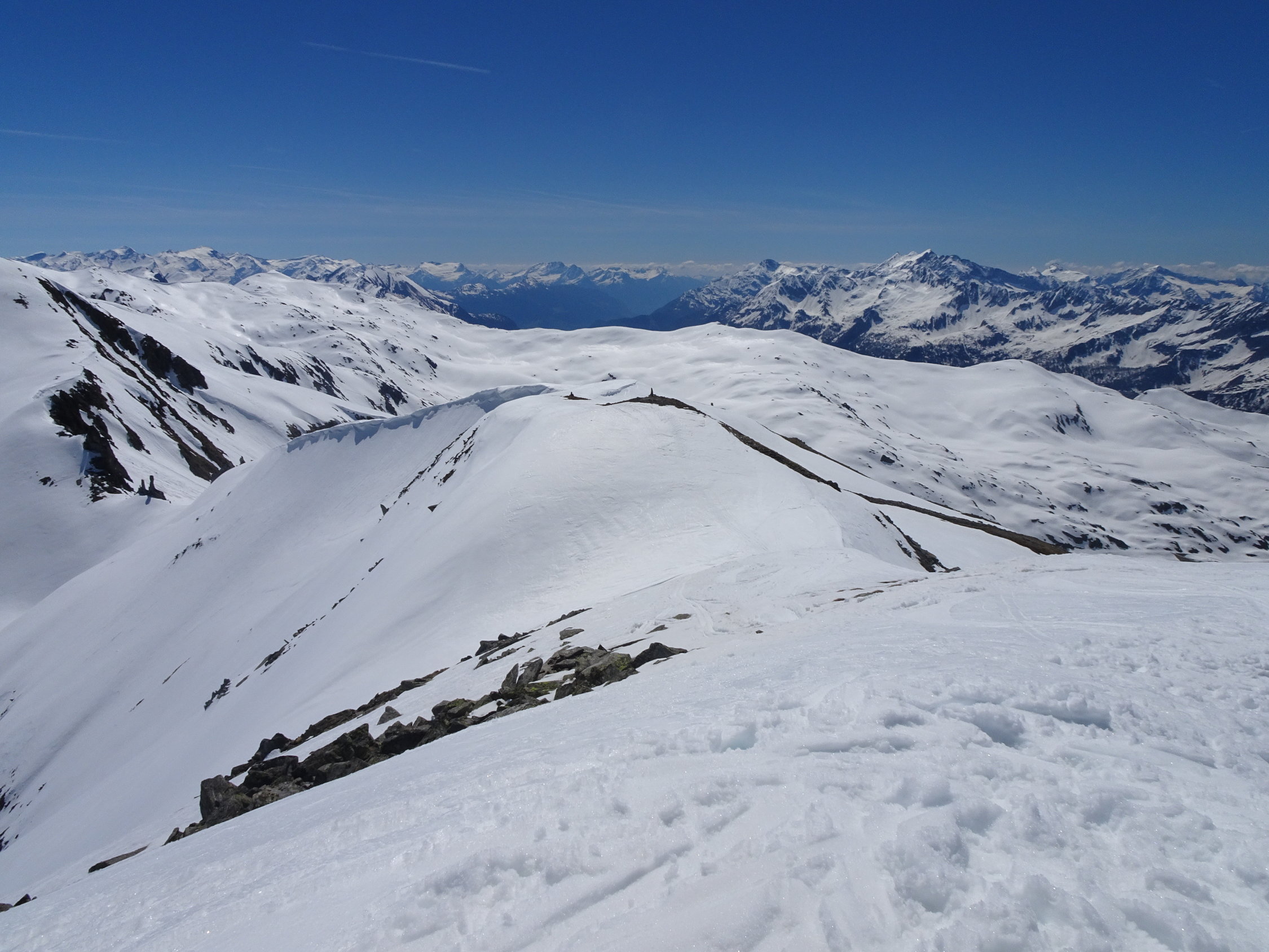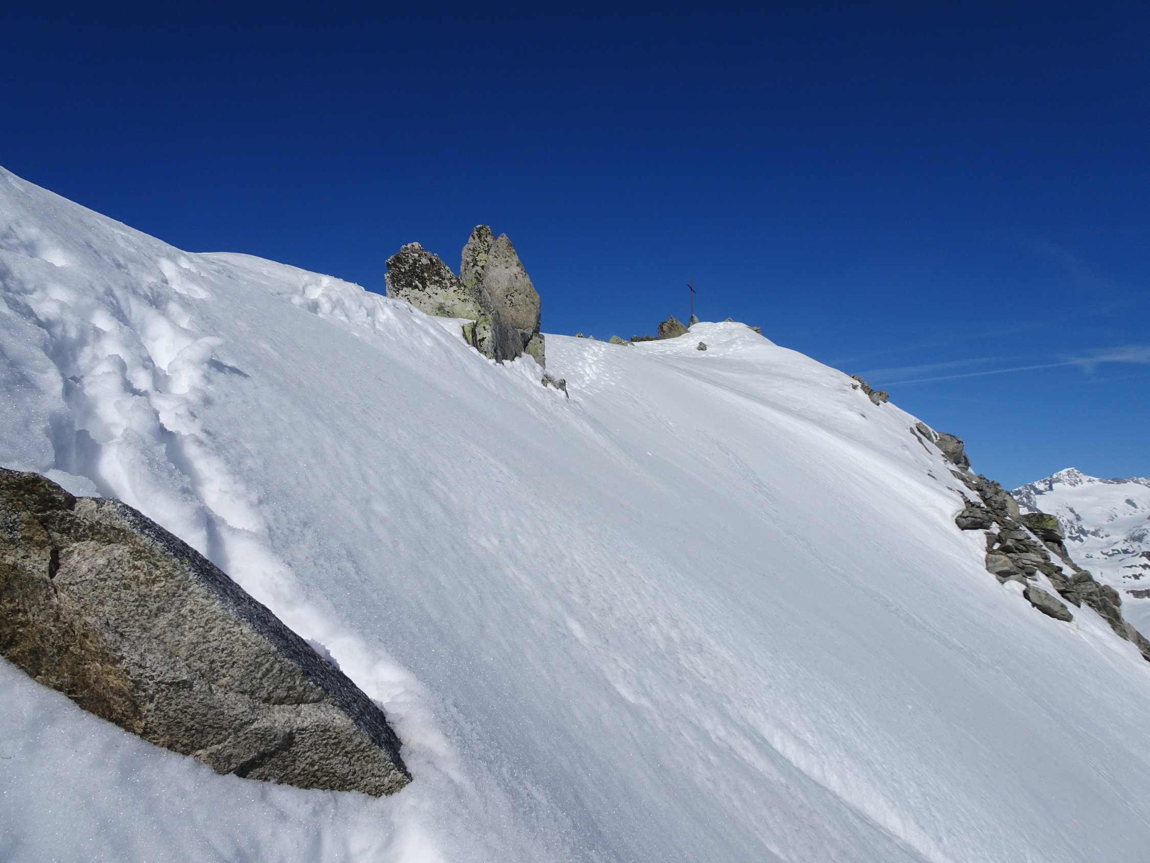 Schnee: allerbeste Frühlings-/Vorsommer-Tourenverhältnisse. Im Aufstieg hart und gut griffig aber nicht eisig. Harscheisen im Schlussaufstieg unterhalb Bassa della Prosa bis zum Ostgipfel 2723m angenehm. Fussaufstieg teilweise aufgrund des vielen Schnees tief und etwas mühsam.