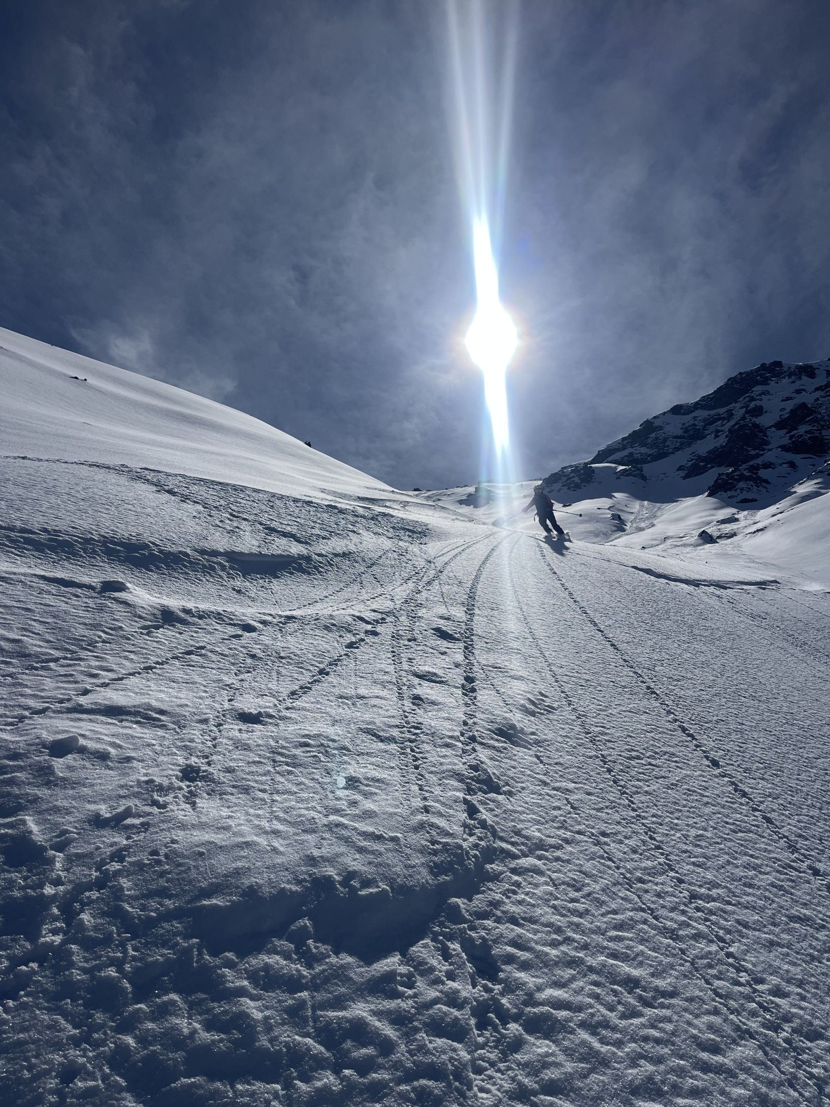 Noch genug Schnee ab Parkplatz, tragend.. Start um 8:00 Initial hart dann ab 1700 m zunehmend eine Schicht Neuschnee. Sehr gute Spur bis kurz vor der Schlüsselstelle - merci !!