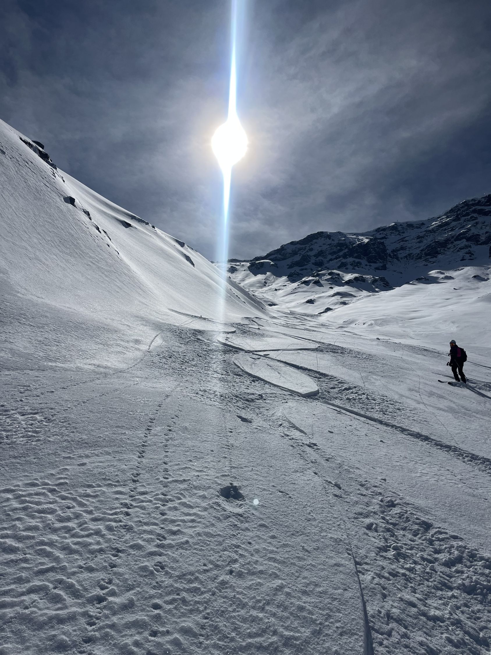 Dann zu Fuss in den Sattel durch viel lockeren Schnee( keine Skispuren) und noch etwas weiter auf dem Grat - dann wieder auf den Ski Schnee am Gipfelhang hartgepresst und Spur eher rutschig. Gipfel wunderbar windstill. Abfahrt mit den Skiern über Grat/ Sattel gut machbar. Anschliessend sind wir nicht Richtung Furggelti gequert sondern einer verlockenden aussehenden Spur gerade nach unten - gute Entscheidung da super Pulver . im ganz unteren Teil dann etwas schwerer / gepresst aber gut zu fahren. Unten im Talboden ein Traum von Sulz