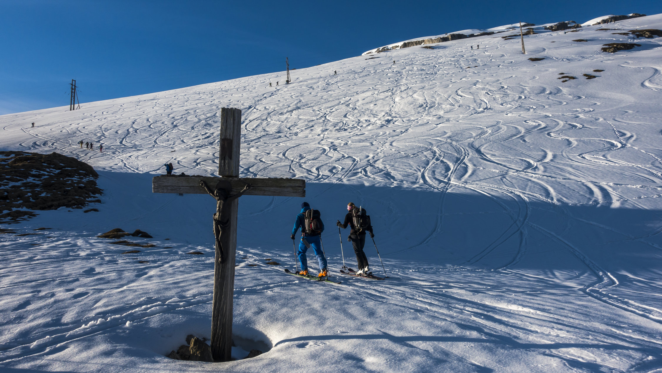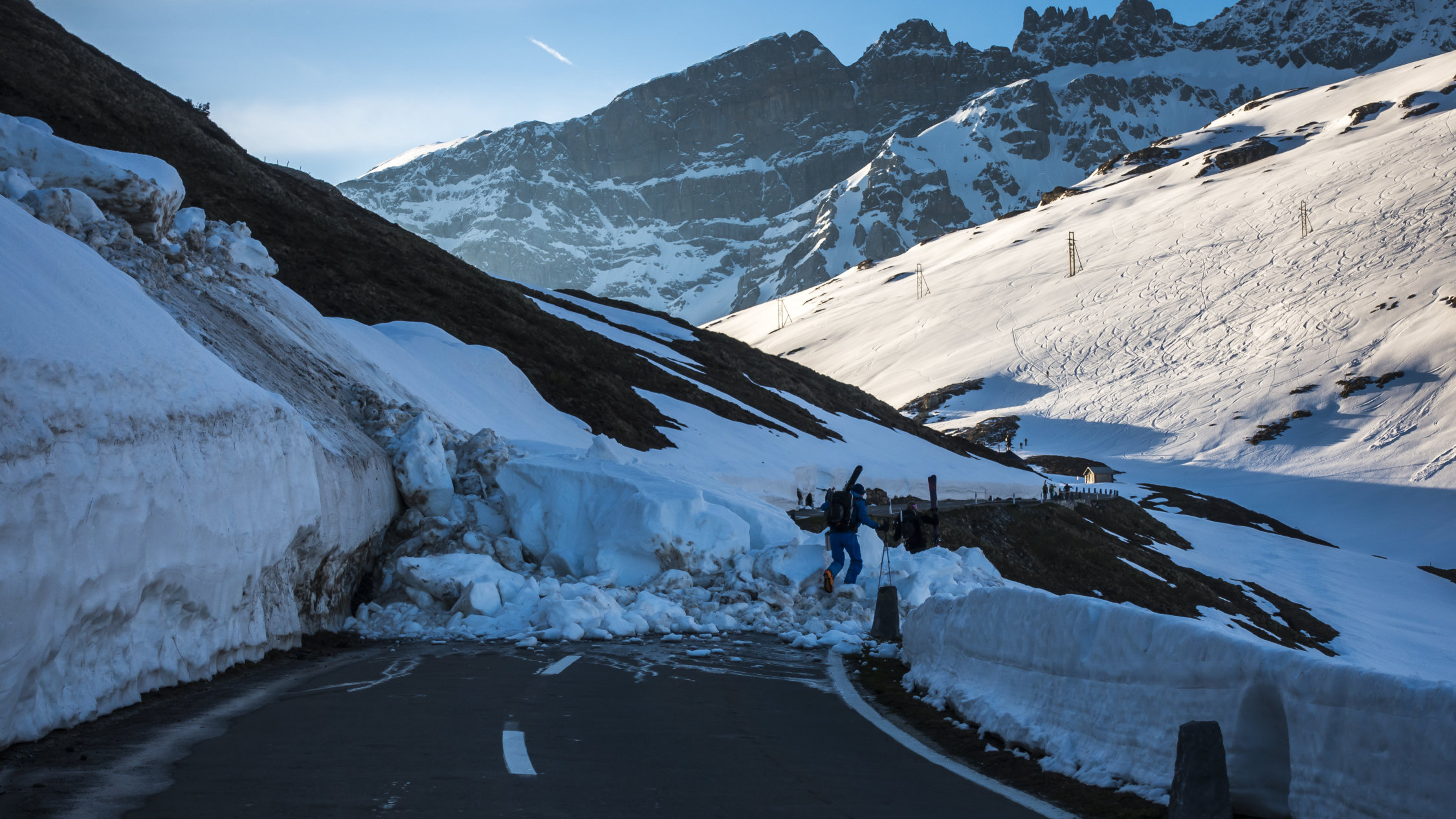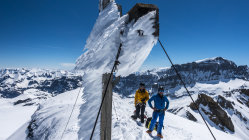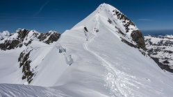 Clariden Freitag, 31.5.: Um 6 Uhr hat eine Lawine die Strasse kurz vor der Passhöhe blockiert, daher vom Hotel zu Fuss bis zur Passhöhe. Traumwetter, +3° bei kaltem Wind. Schneedecke pickelhart gefroren. Sehr gute Aufstiegsspur, daher ohne Harscheisen bis zum Skidepot unter dem Vorgipfel. Von dort bei gutem Trittschnee über den Vorgipfel an den Fuss des Hauptgipfels. Mit Pickel und Steigeisen schönes klettern auf den Gipfel. Alle Ketten sind frei, man kann sich überall gut halten. Abfahrt ab Skidepot um 13 Uhr, mit dem Wind hat es lange gedauert bis der Schnee aufweichte. Herrlicher Sulz auf den oberen zwei Drittel, unten teils Bremsschnee.