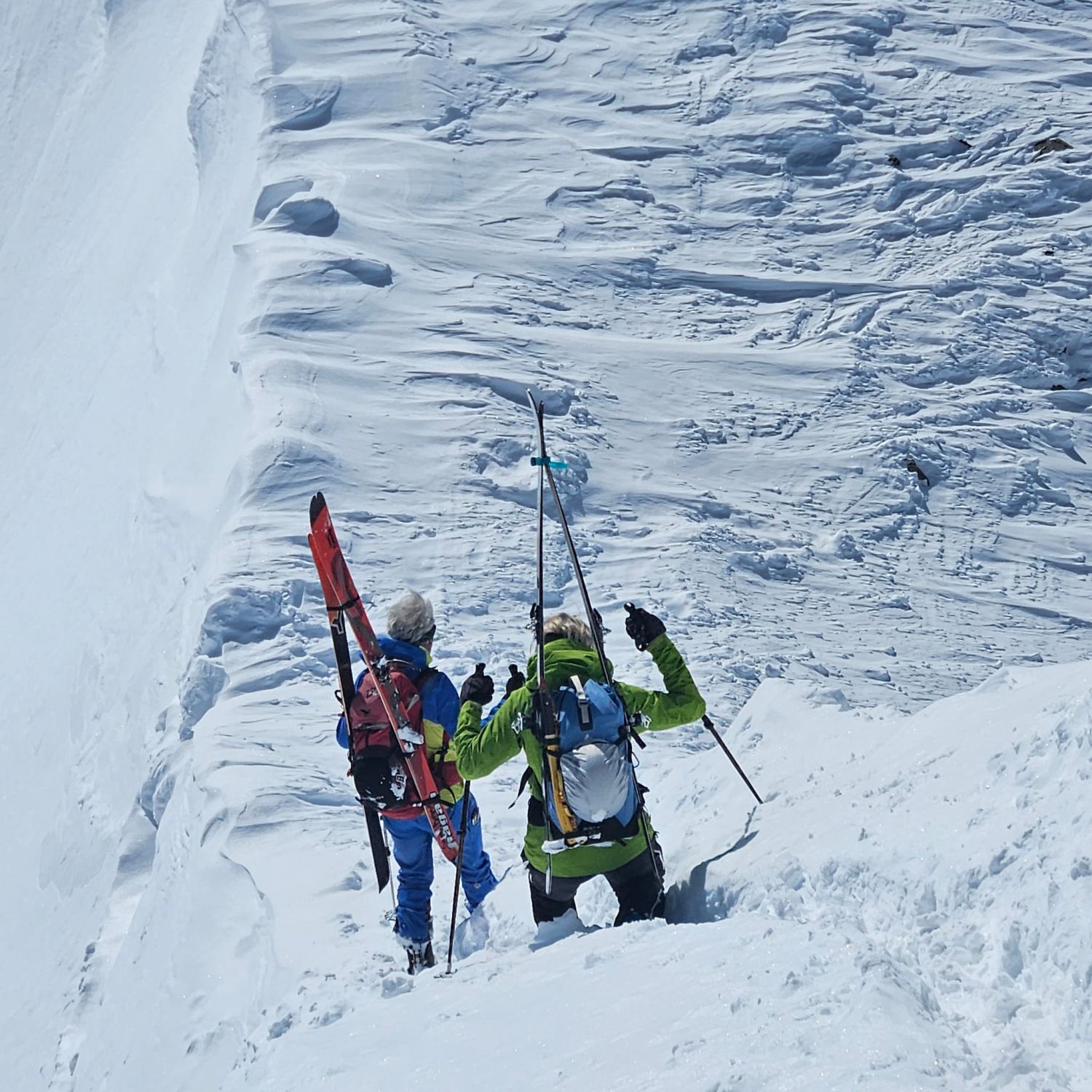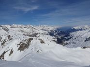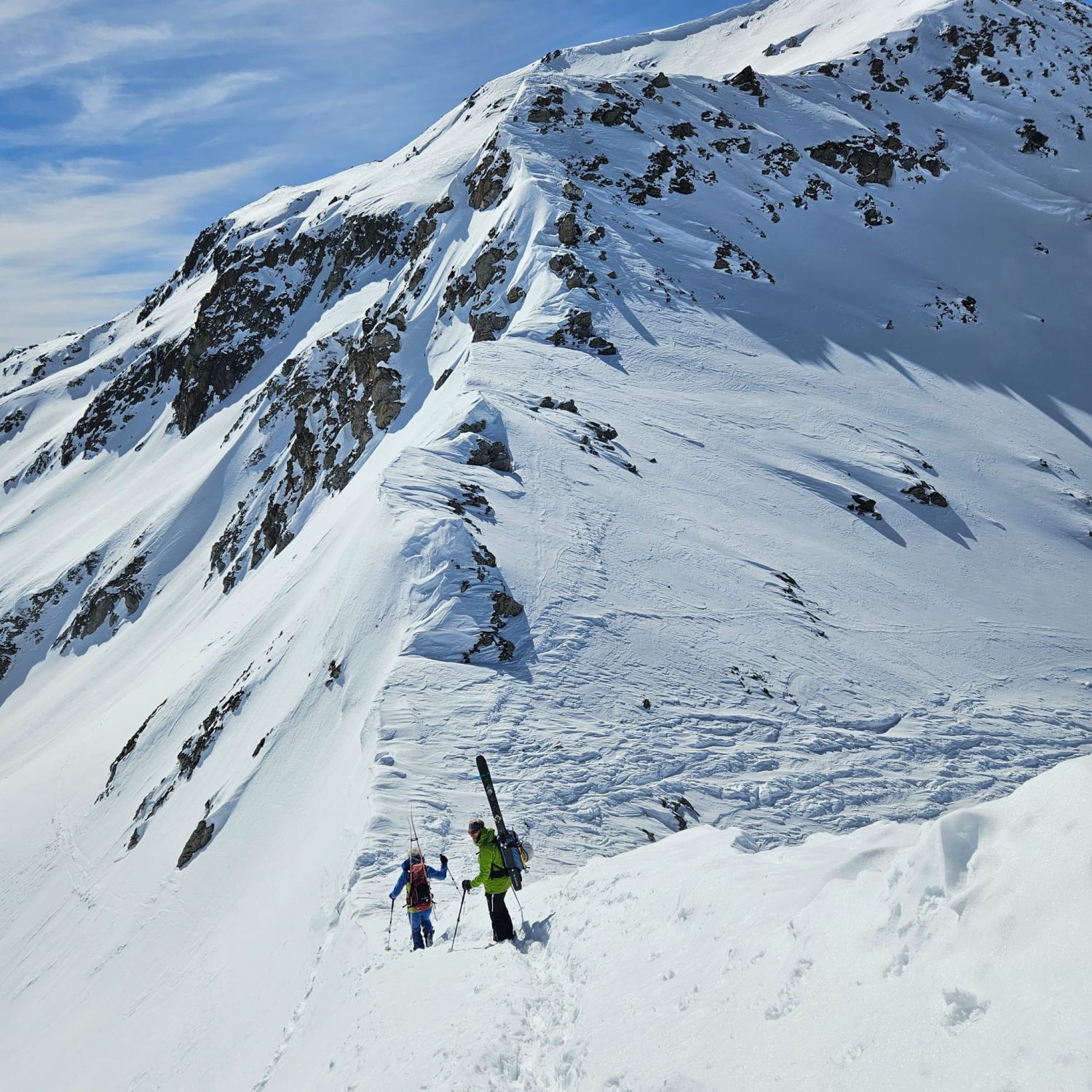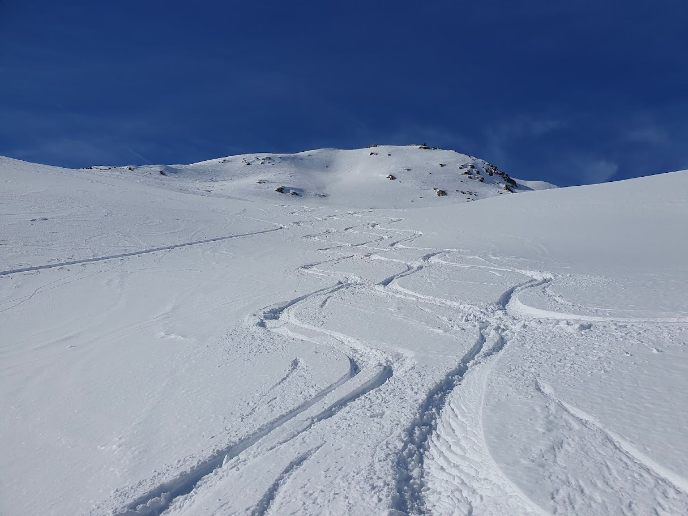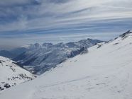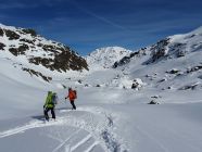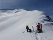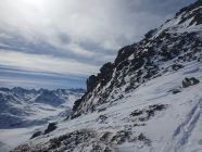 Auf verblasener Aufstiegsspur zum Pazolastock, anschliessend Gratwanderung durch knietiefen Pulverschnee zum Pt. 2742 und weiter zur Martschallücke. Hier haben wir die Steigeisen montiert und sind im Aufstieg teils hüfttief eingesunken. Trittfeste Fussstapfen im oberen Bereich waren die Ausnahme. Der ganze Krampf wurde dann bei der Abfahrt vom Rossbodenstock Rtg. Tomasee belohnt. Mehrheitlich Pulverschnee und alle Hänge nur für uns.