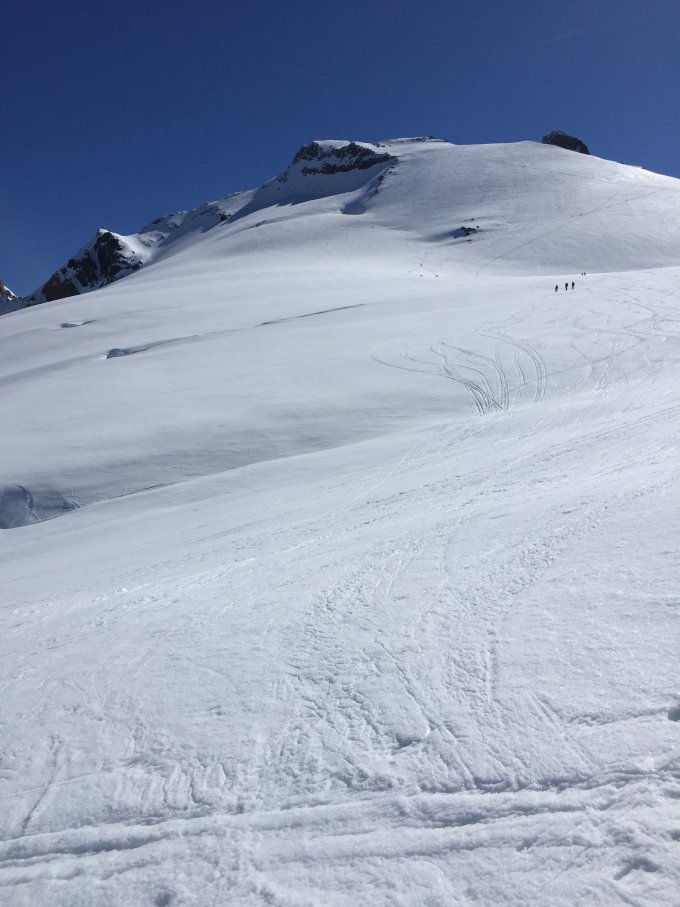Am Vortag Zugang via Chüebergli auf den Gletscher, Abfahrt via Steinsee über den ganzen Gletscher. Start auf dem Gipfel 09:30h, die obersten 300 Hm hart, dann zunehmend aufgesulzt und bis Steingletscher passend.