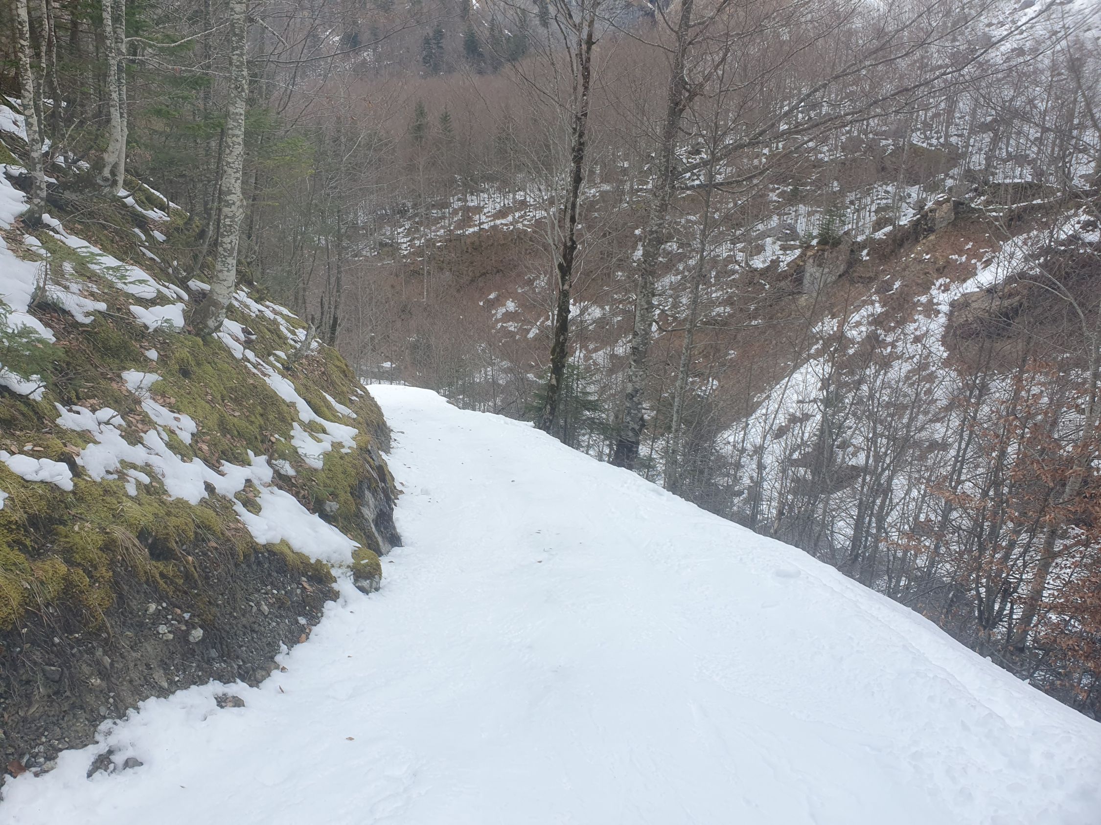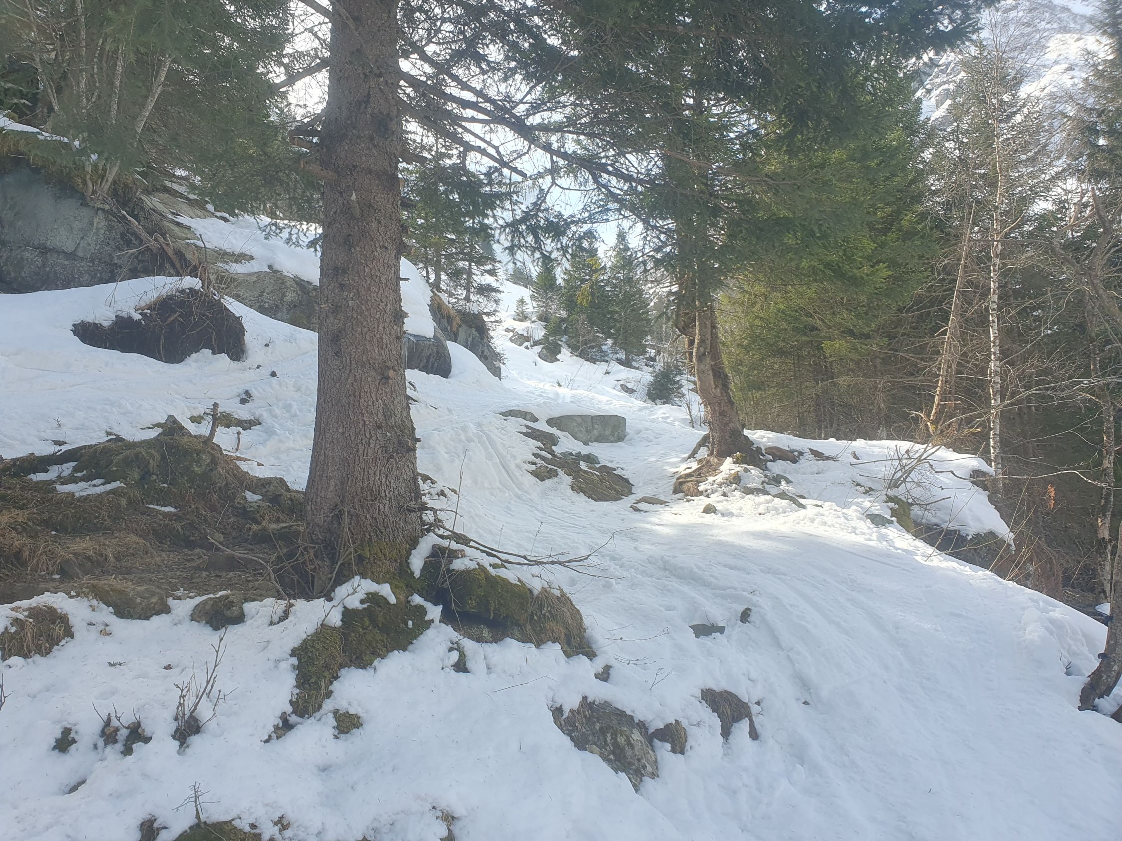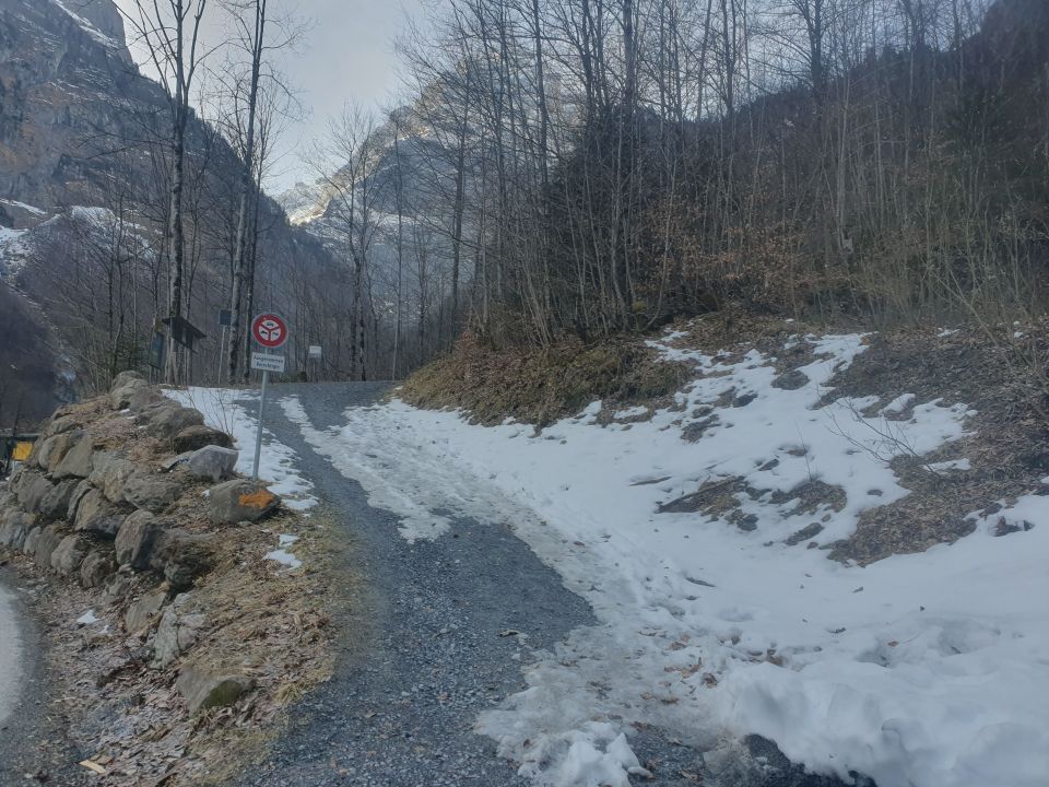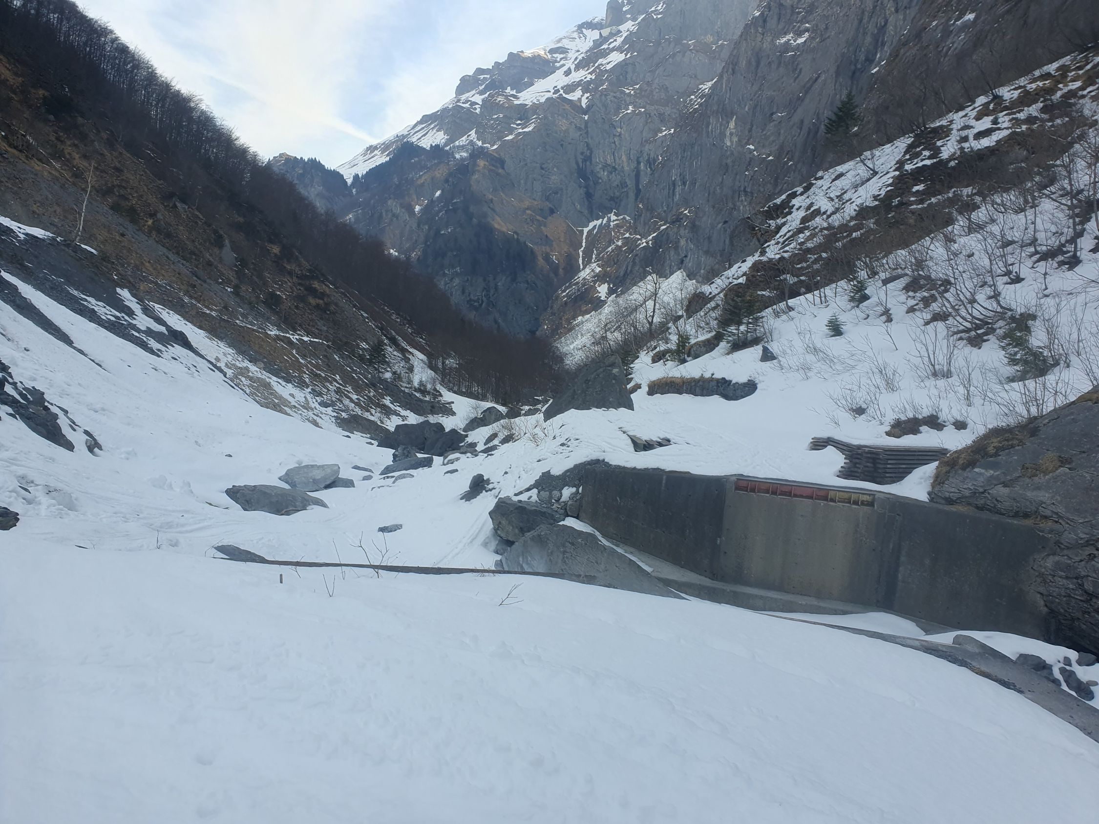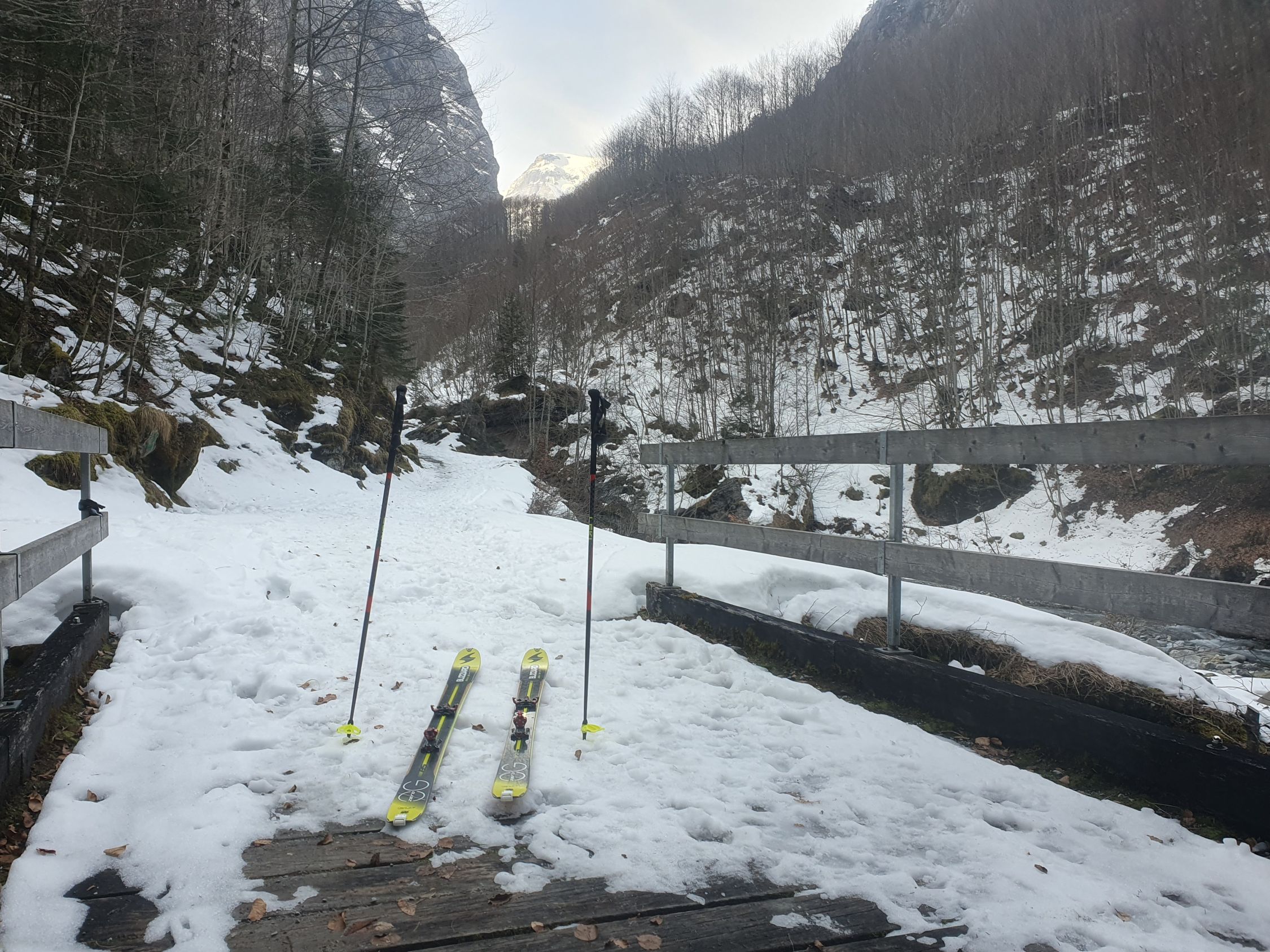 Weiter mit Ski auf einer meist durchgehenden Schneedecke weiter in Richtung Vorder Sand. Die zwei abmontierten Brücken können mit Ski gut umgangen werden. Nun flach leicht abfallend bis Hinter Sand und auf einer harten und etwas rutschigen Spur, aber ohne Harscheisen noch gut machbar, durch den Wald auf dem Wanderweg und später bei Tänntiwag der Skitourenroute nach leicht ausholend durch eine kleine Schlucht hindurch zum Bifertengletscher.