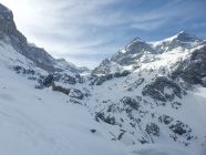 Für die Abfahrt um 16:00 habe ich in Bezug auf die Schneequalität keine grossen Erwartungen und so war es auch: Zuoberst Hartschnee, dann gepresster Pulver und nach 3200Hm bis Ende Gletscher doch noch Pulver und in den Abbrüchen pistenähnliche Abrutschspuren. Danach nach Tänntiwang Bruchharst vom "feinsten" mit einer mühsamen buckligen Piste östlich des Wanderweges hinab. Im Wald auf Hart- und Bruchharst weiter bis Hinter Sand. Ich genoss danach den Hartschnee weiter bis kurz vor Tierfed. Für die zwei kurzen Wiederanstiege ziehe ich die Ski nächstes Mal doch lieber ab. Bis Tierfed muss man deswegen für die Abfahrt doch noch mit rund 2 Stunden rechnen.