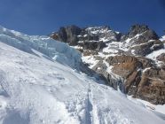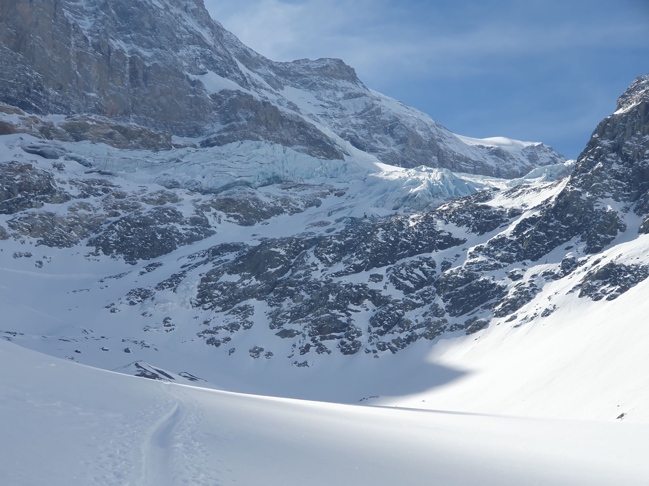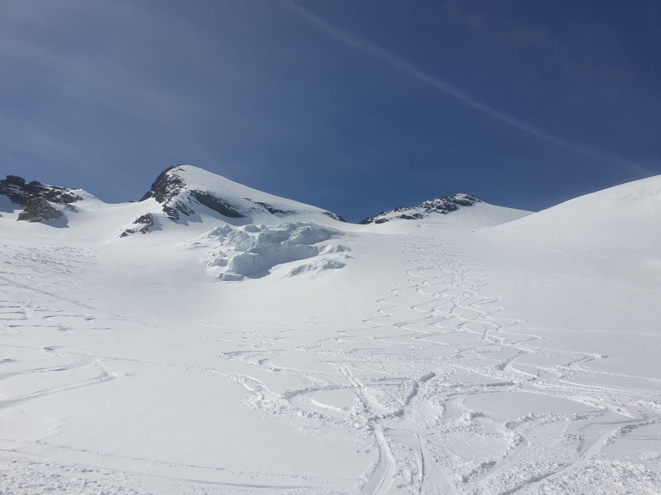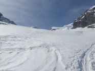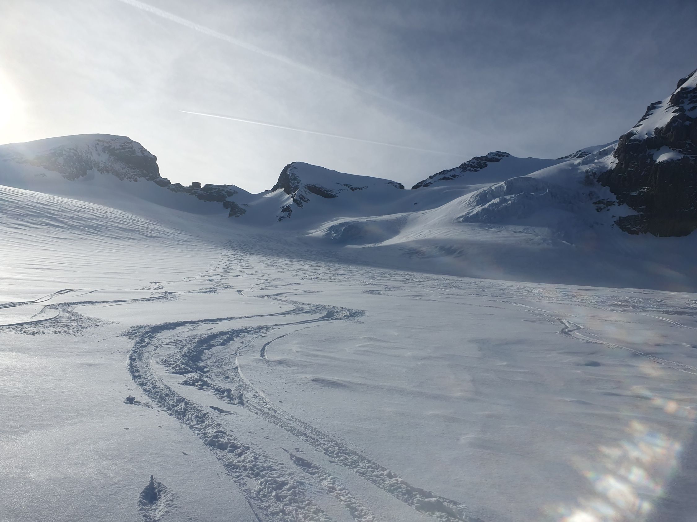 Glücklicherweise waren heute beide Abbrüche durchgehend mit Ski machbar, so, dass ich meine Steigeisen und Pickel im Rucksack belasse. Beim zweiten Abbruch scheint jedoch das Eis schon an sehr vielen Orten hervor, so, dass sich hier die Bedingungen schnell ändern können. Mind. Steigeisen und Pickel würde ich für diese Tour immer im Sack dabei haben. Nach dem 2ten Abbruch habe ich zwei Gruppen abfahren sehen.