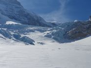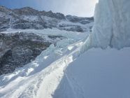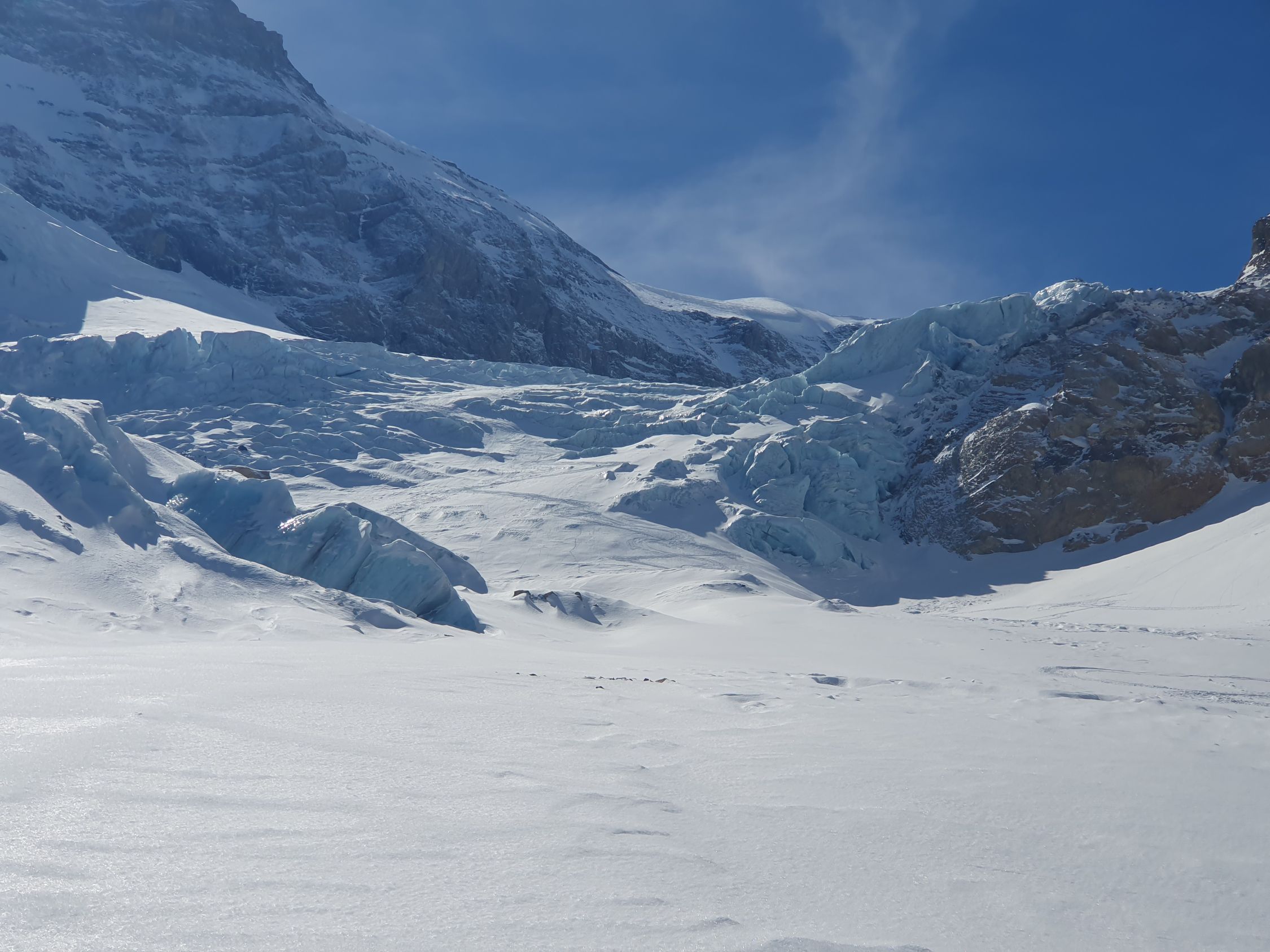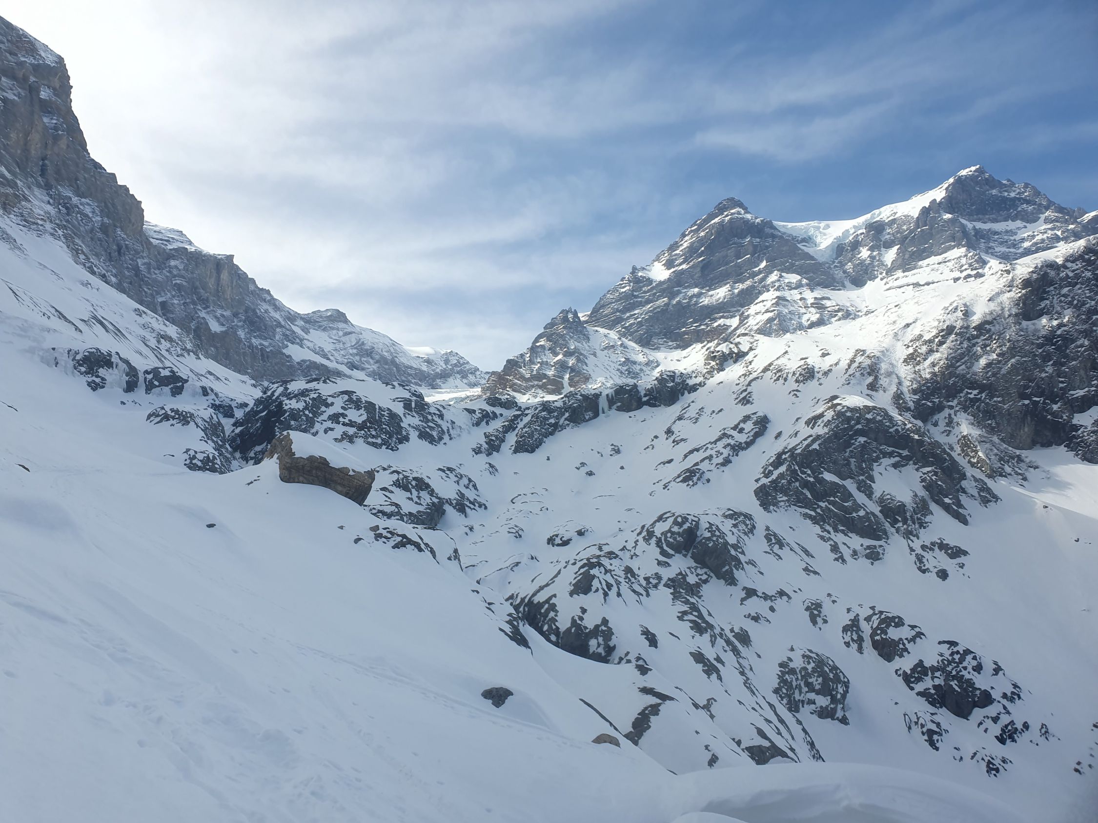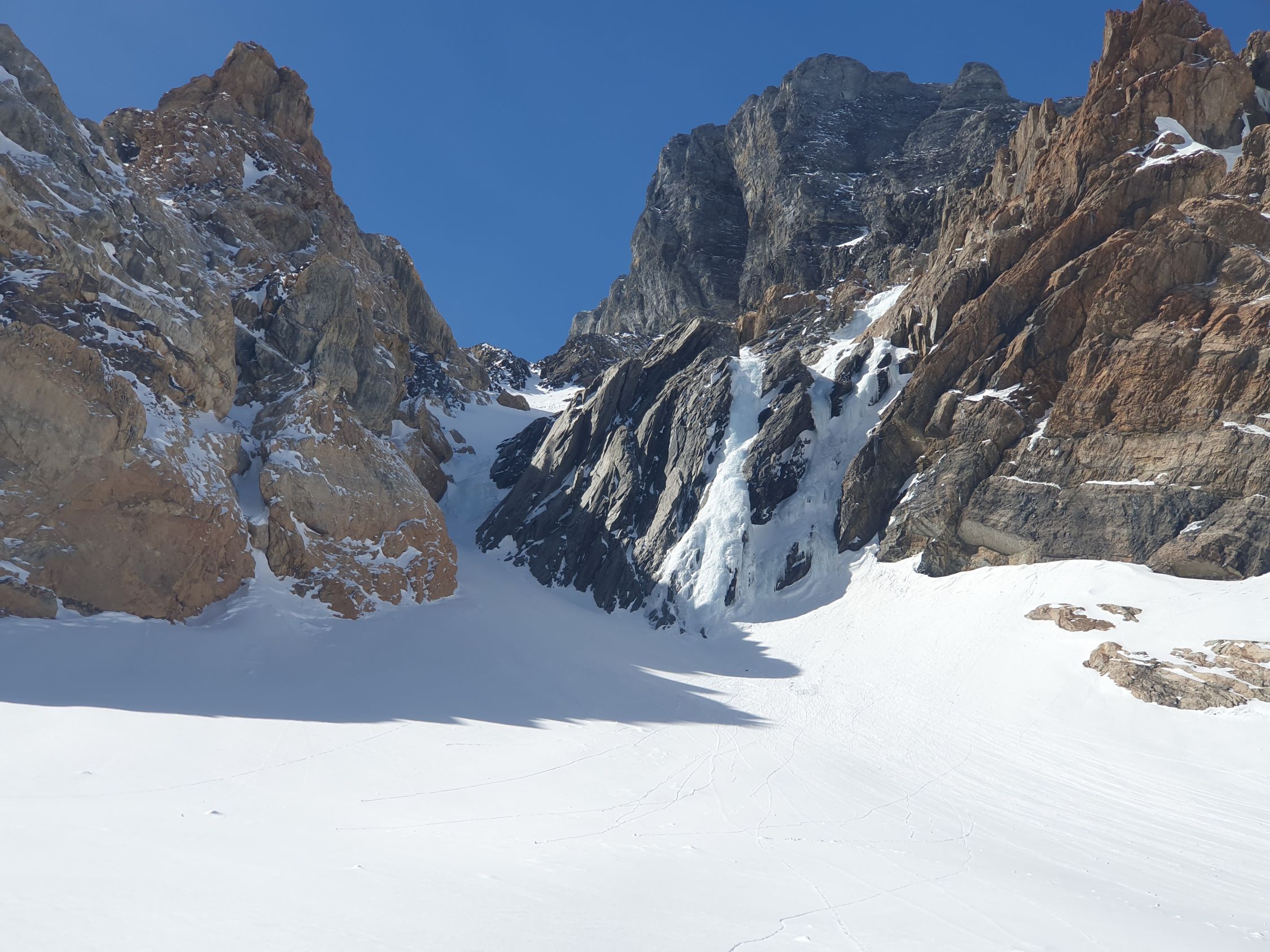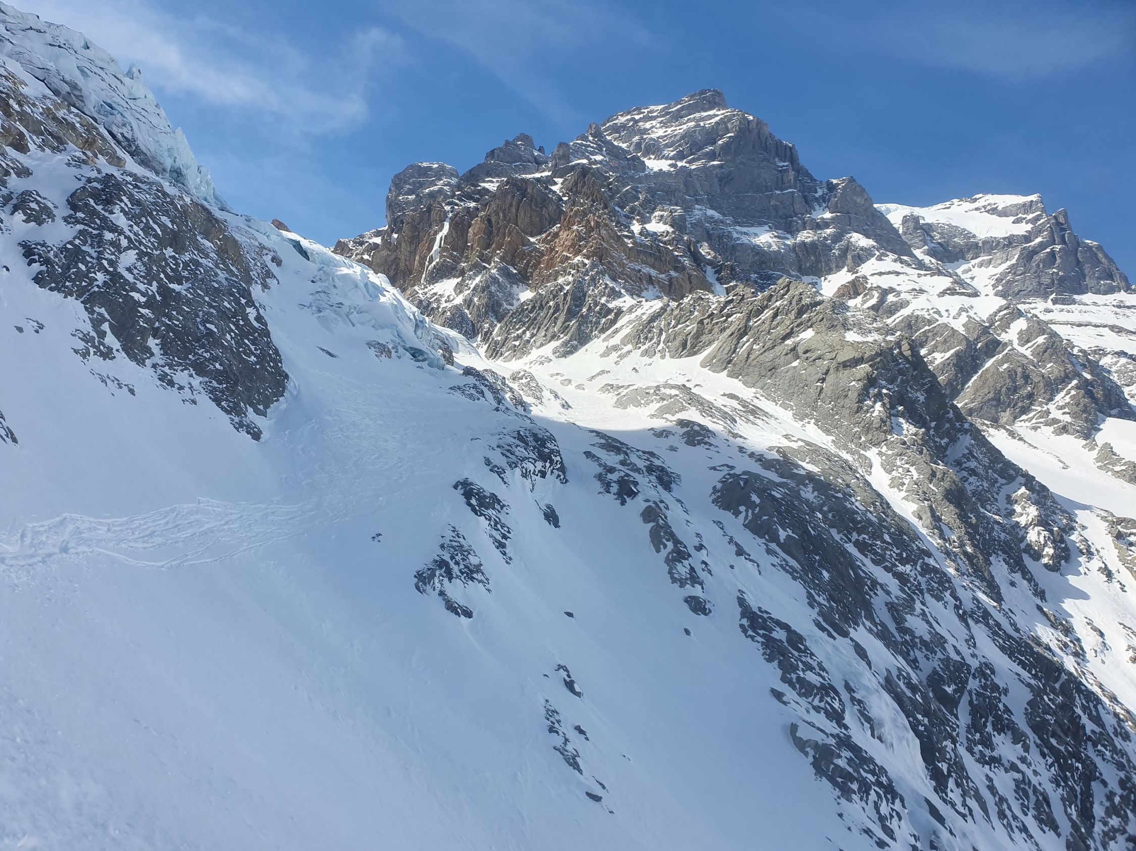 Glücklicherweise waren heute beide Abbrüche durchgehend mit Ski machbar, so, dass ich meine Steigeisen und Pickel im Rucksack belasse. Beim zweiten Abbruch scheint jedoch das Eis schon an sehr vielen Orten hervor, so, dass sich hier die Bedingungen schnell ändern können. Mind. Steigeisen und Pickel würde ich für diese Tour immer im Sack dabei haben. Nach dem 2ten Abbruch habe ich zwei Gruppen abfahren sehen.