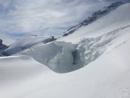 Nun nördlich über ein paar gut eingeschneiten Spalten und zuletzt "einfach" zum Gipfel, wobei hier nicht das Gelände schwierig ist, sondern ich mit den schwindenden Kräfte zu kämpfen habe (warum habe ich mir bloss bis anhin noch keine nötige Pause gegönnt?).