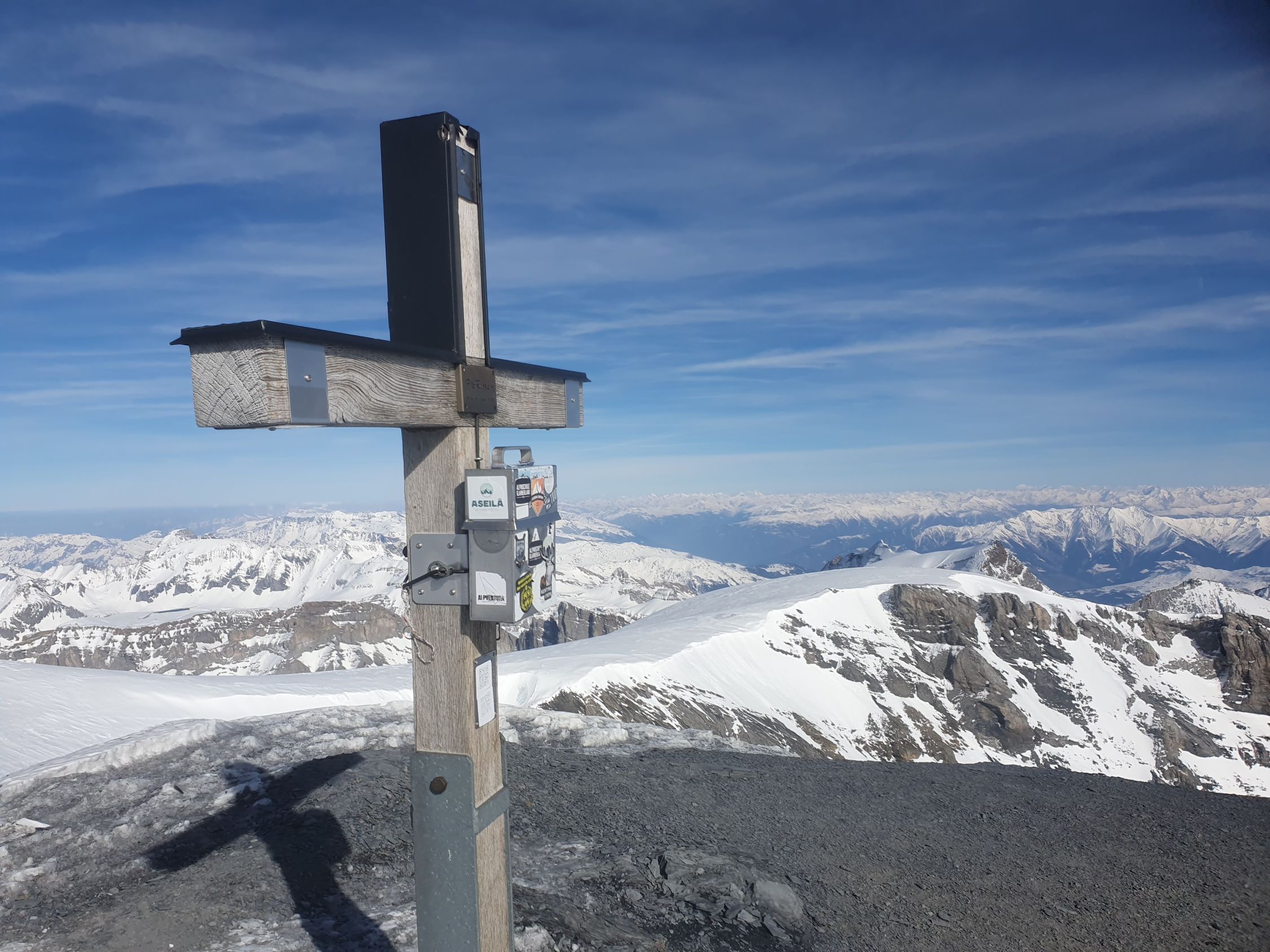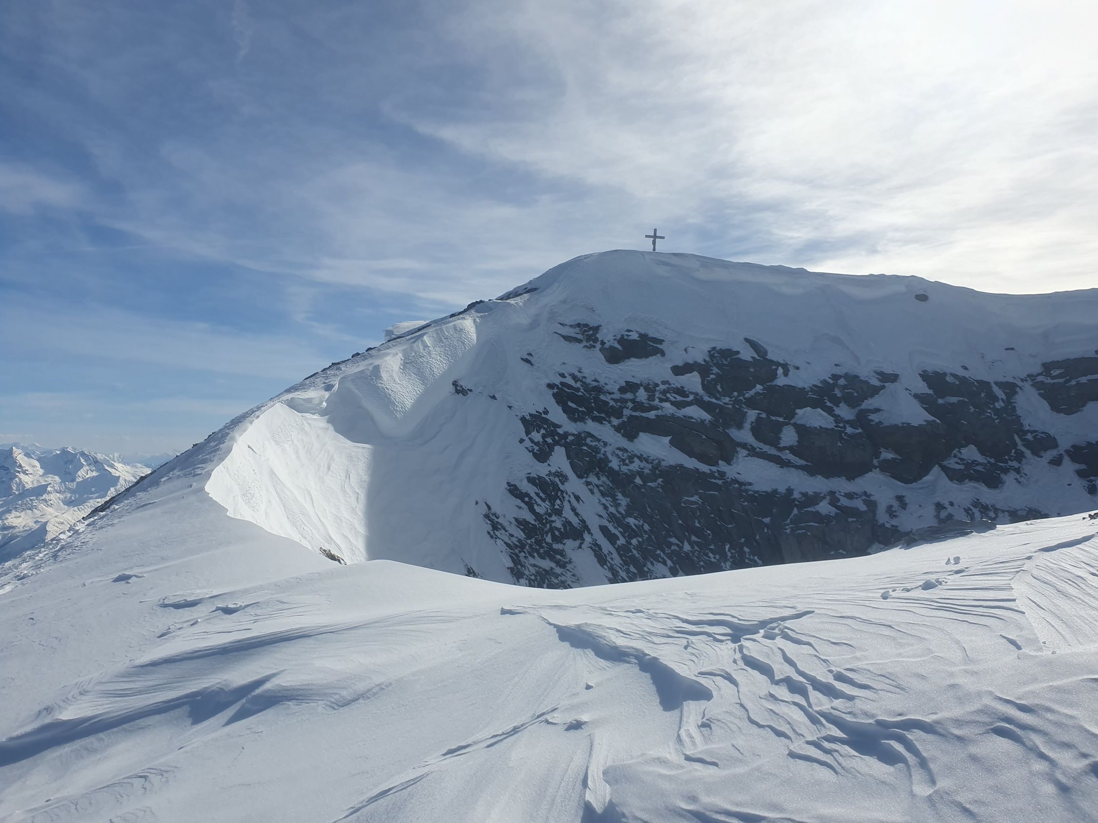 Kurz vor dem Gipfel muss ich wegen ein paar Windböen doch noch alles anziehen was ich habe. Die letzten paar Meter zum Gipfel steige ich zu Fuss hoch zum Gipfelkreuz und geniesse endlich meine Pause, die ich heute den ganzen Tag lang immer wieder nach hinten verschoben hatte.