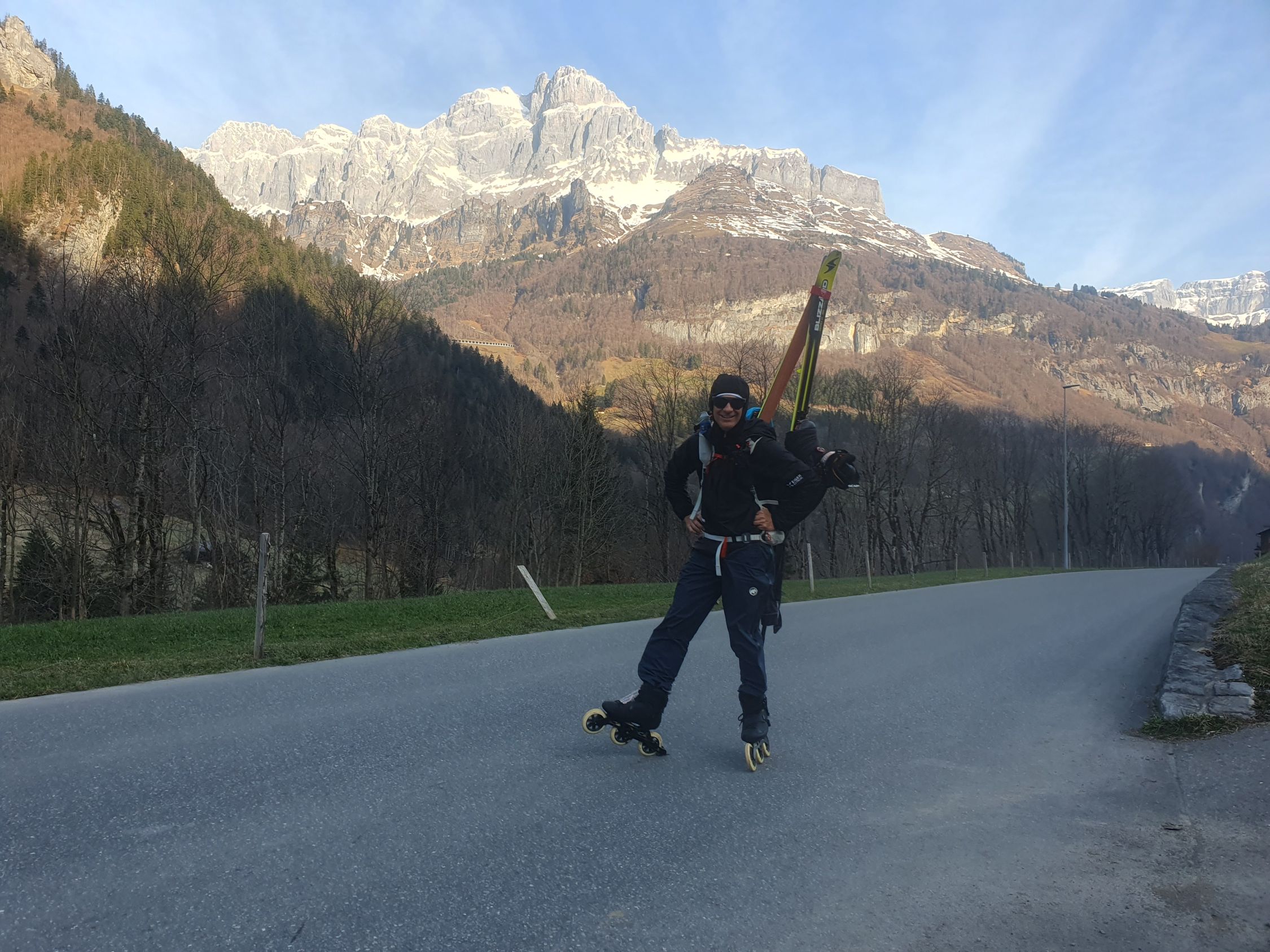 Auch bei mir schwebte schon lange der Wunsch den Tödi an einem Tag anzugehen. Gestern Abend kurzfristig entschieden und heute 3'000 Hm von Linthal zum Piz Russein gemacht. Da stellt sich natürlich schnell mal die Frage, wie man als ÖV-Tourist am besten nach Tierfed kommt? Klar, zu Fuss oder mit dem Velo wäre es wohl schneller und am einfachsten gewesen. Bei einer kurzen geteerten Strasse kommen mir, wie auch schon bei ein paar anderen Skitouren von mir, meine Inline Skates in den Sinn.