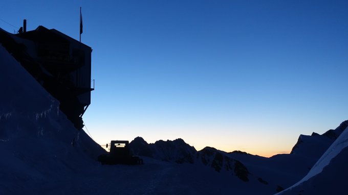 Heute stand genau nach 6 Monaten und einem Tag die 47.te und letzte Skitour des Winters 2019 auf dem Programm. Am vierten Tag unser Touren im Berner Oberland starteten wir um kurz vor 5 an der Mönchsjochhütte. Nach einer kurzen Abfahrt über den hart zugefrorenen Gletscher ging es in den Anstieg in Richtung Ostsporn des Rottalhorn, welcher zum Rottalsattel hoch führt. Der Schnee war hart gefroren, so dass man zwingend Harscheisen brauchte. Mit uns waren noch eine 3er und 2 2er Gruppen gestartet, mit einer Stunde Vorsprung war ein Bergführer mit 2 Kunden zu Fuß unterwegs. Der Bergschrund kurz vor dem Rottalsattel beim Skidepot verlangte etwas Zutrauen, ansonsten war der Aufstieg bis zum Rottalsattel problemlos. Für den weiteren Anstieg nach dem Rottalsattel gingen wir die linke Spur durch die Steilstufe, welche perfekten Trittschnee hatte. Um 08:45 standen wir bei Windstille und bestem Wetter auf der Jungfrau, einfach perfekt.
