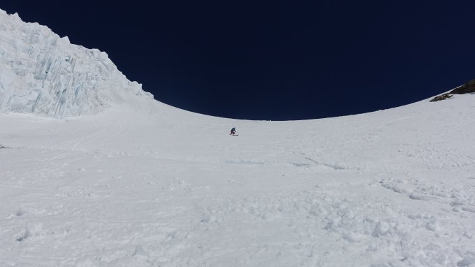 Die Aufstiegsroute zurück im Abstieg verlief ebenfalls problemlos. Es kamen noch etwa 8 Leute entgegen, die wohl an der Konkordiahütte gestartet waren. In der Abfahrt hatte es inzwischen aufgefirnt, so dass diese auch kein Problem war. Wir wählten vom Grat aus die direkte, steile Abfahrt, welche bei diesen Bedingungen einfach nur toll zu fahren war.