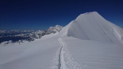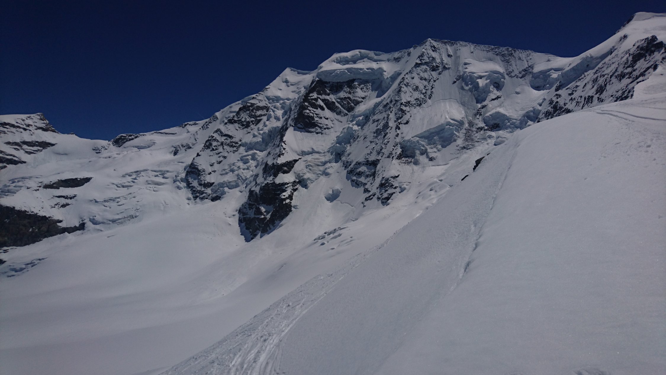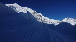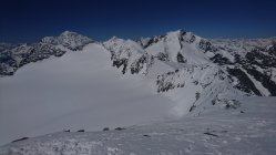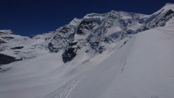 Start bei Talstation Diavolezza, Aufstieg auf Piste zur Bergstation. Durchgehend Schnee. Kurze Abfahrt auf den Gletscher - Hartschnee. Aufstieg über Gletscher problemlos, recht verspurt. Weg auf dem Grat eisfrei, gut zu gehen. Weiterweg auf Bellavista (P.3885) auch gut. Abfahrt durch den Gletscherbruch "Fuor" etwas abenteuerlich, allzu lang sollte man sich dort nicht aufhalten. An P.3185 vorbei auf den Gletscher, Wiederaufstieg zur Diavolezza Bergstation auf guter Spur easy, bloss um 13:00 recht heiss. Auf Piste runter auf Firn/ Nassschnee.