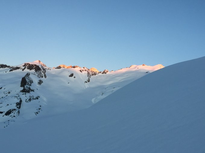 Momentan ist es grundsätzlich zu warm. Sollte es nochmal für mind. zwei bis drei Tage kalt werden, dh Nullgrad auf 2000m, könnte diese Seite des Gauli schätzungsweise noch eine Weile gute Tourenbedingungen haben.