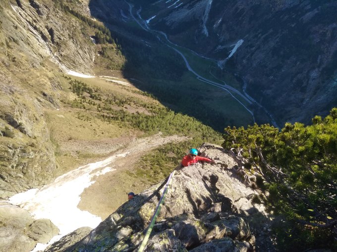 Meiner Meinung nach eher eine alpine Sportklettertour (7a max, 6b obl) als eine Plaisirroute, insbesondere weil ab L7 bis zum Routenende kein Rückzug möglich ist. Die Cruxlänge ist echt herausragend (stark überhängende 7a-Henkelparade in äusserst luftiger Position).