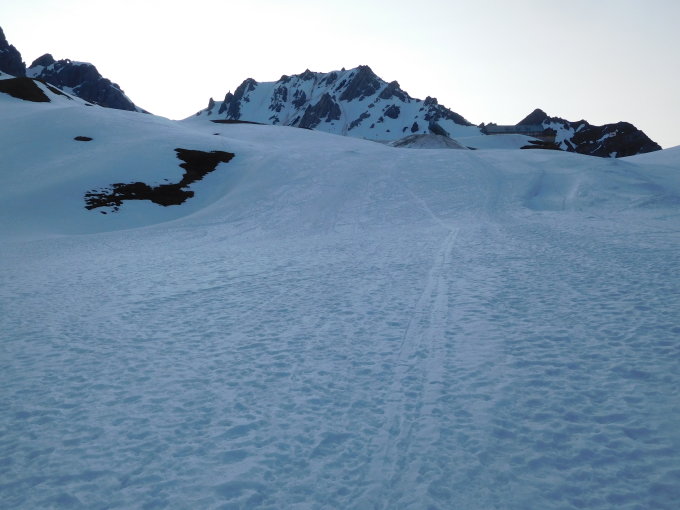 Aufstieg+Abfahrt durch die Südrinne mit Ski möglich - durch viele Lawinenabgänge der letzten Tage etwas erschwert. Allein im Gebiet - außer Bauarbeiter