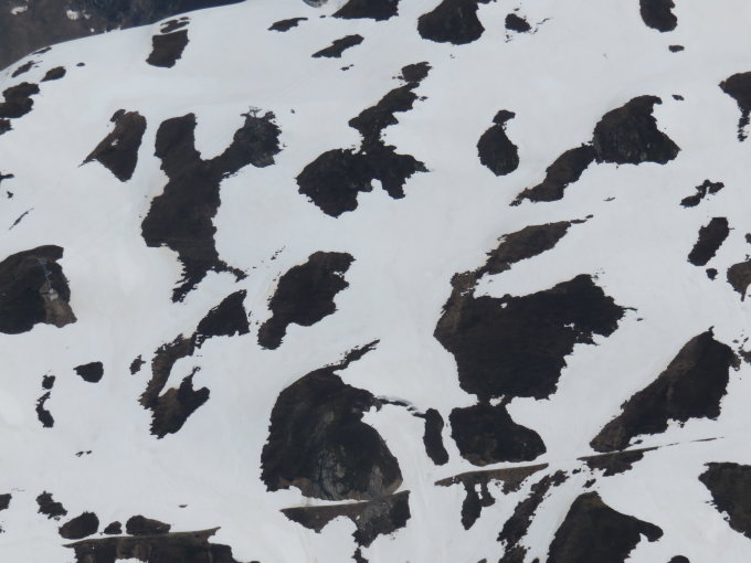Sicher noch einige Wochen machbar, wenn die Klimaerwärmung nicht in vollem Umfang einbricht. Der Übergang (Abstieg) vor dem Gipfelaufschwung ist etwas heikel. Tiefer Schnee. Auf dem Rückweg kann man die Höhe behalten und unterhalb des Kamms queren. Da der Schnee sehr nass ist, ist auch das nicht ganz einfach die Spur zu halten und nicht abzurutschen.