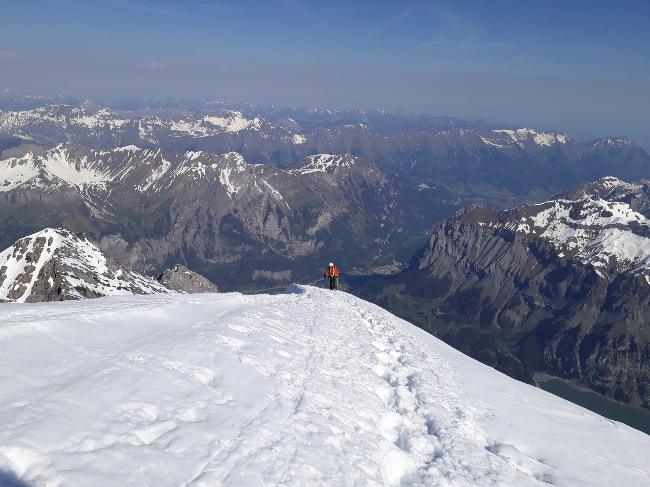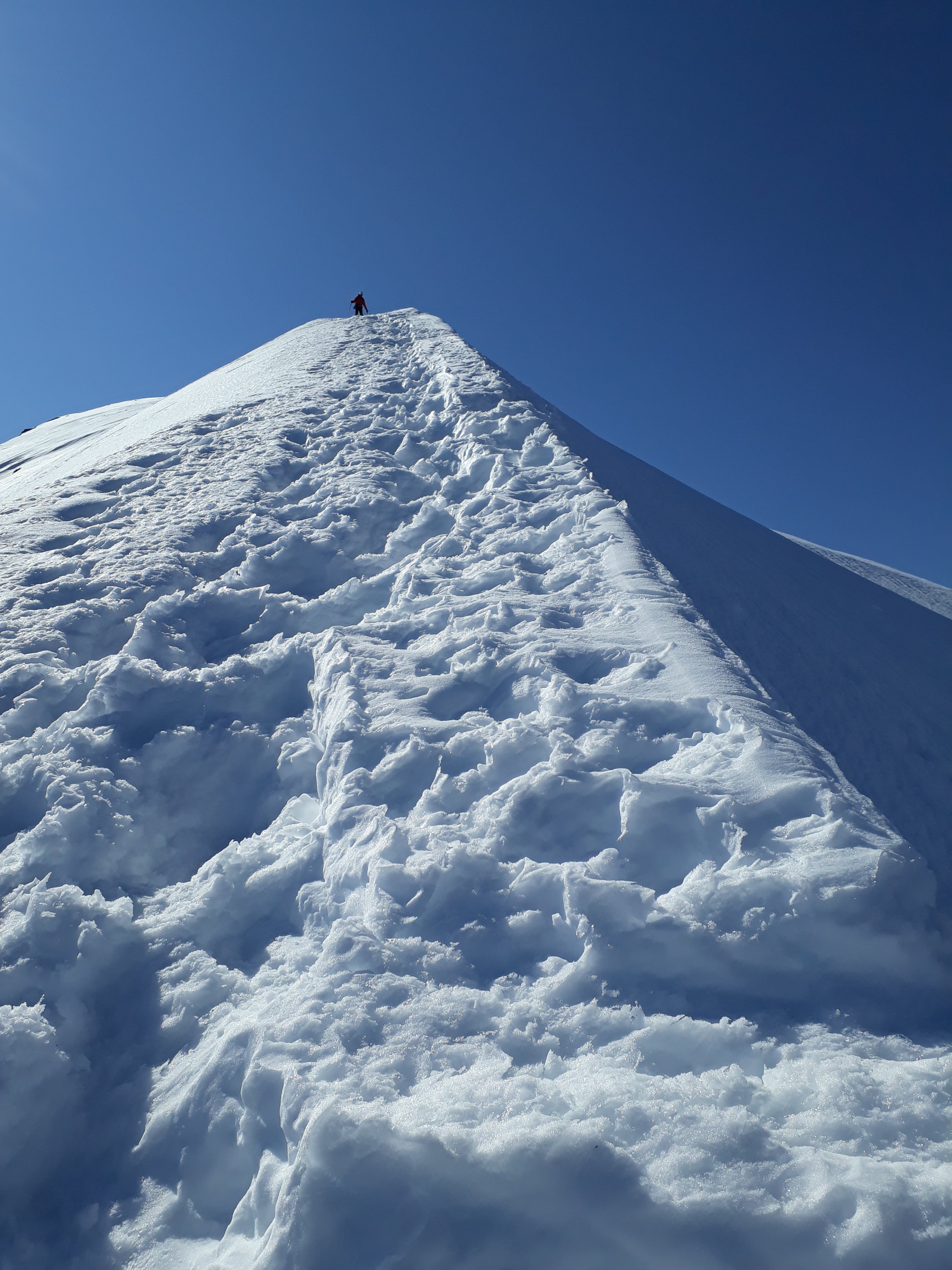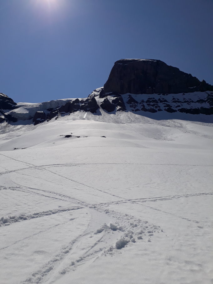 Trotz der warmen Temperaturen sehr gute Schneeverhältnisse; im Couloir kein Steinschlag und guter Trittschnee. Gipfelgrat momentan sehr breit und gut zu begehen. Besonders bei der Abfahrt Nassschneerutsche im unteren Teil beachten.