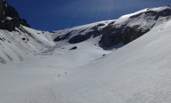 Start Sunnbüel, erste Bahn 8h30. Bis Schwarenbach zu Fuss (knappe Stunde, Bike empfehlenswert! 5 CHF einfach), ab dort auf geschlossener Sommerschneedecke (tragend, nass) bis auf ca. 2500m. Überquerung Nassschnee-Lawinenkegel und auf nicht tragendem Schnee zum Pass hochgespurt. Ab dort pickelhart (Harscheisen bis Gipfel) bis ca. 3250m, dann von alter Spur und tageszeitlicher Erwärmung profitiert und in guten Verhältnissen hoch.