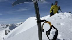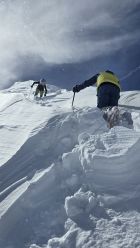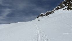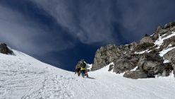 Das Gipfelcouloir ist im Riegelbereich (ca. 40 Hm) nicht ganz ohne. Oberhalb folgt guter Trittschnee und ein überwächteter Gipfelgrat.