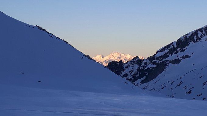 Traumhafte Bedingungen. Super Fernsicht. Abfahrt grandios auf breiter "Piste". Frühling im Tal. Skis mussten eine Stunde getragen werden.