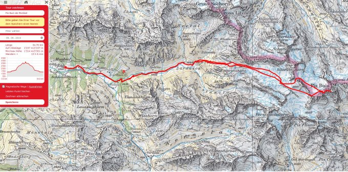 Start mit dem Bike hinter Monbiel um 3 Uhr bei Sternklarer Nacht. Ab 1570 Schneereste auf der Alpstrasse und ab Mässboden Bäume und Lawinenreste auf dem Fahrweg. Bikedepot bei P. 1687, zu Fuss bis ca. 1780 und nun mit den Tourenskis anfänglich auf weichem Altschnee zum Galtürtäli. Nun auf Hartschnee über den Gletscher auf R. 422 zum übergang zwischen Egghorn und Signalhorn. Abfahrt auf schwachem Sulzschnee zum Ochsentalgletscher und zum Skidepot vom Piz Buin. Mit Steigeisen zum Gipfel.