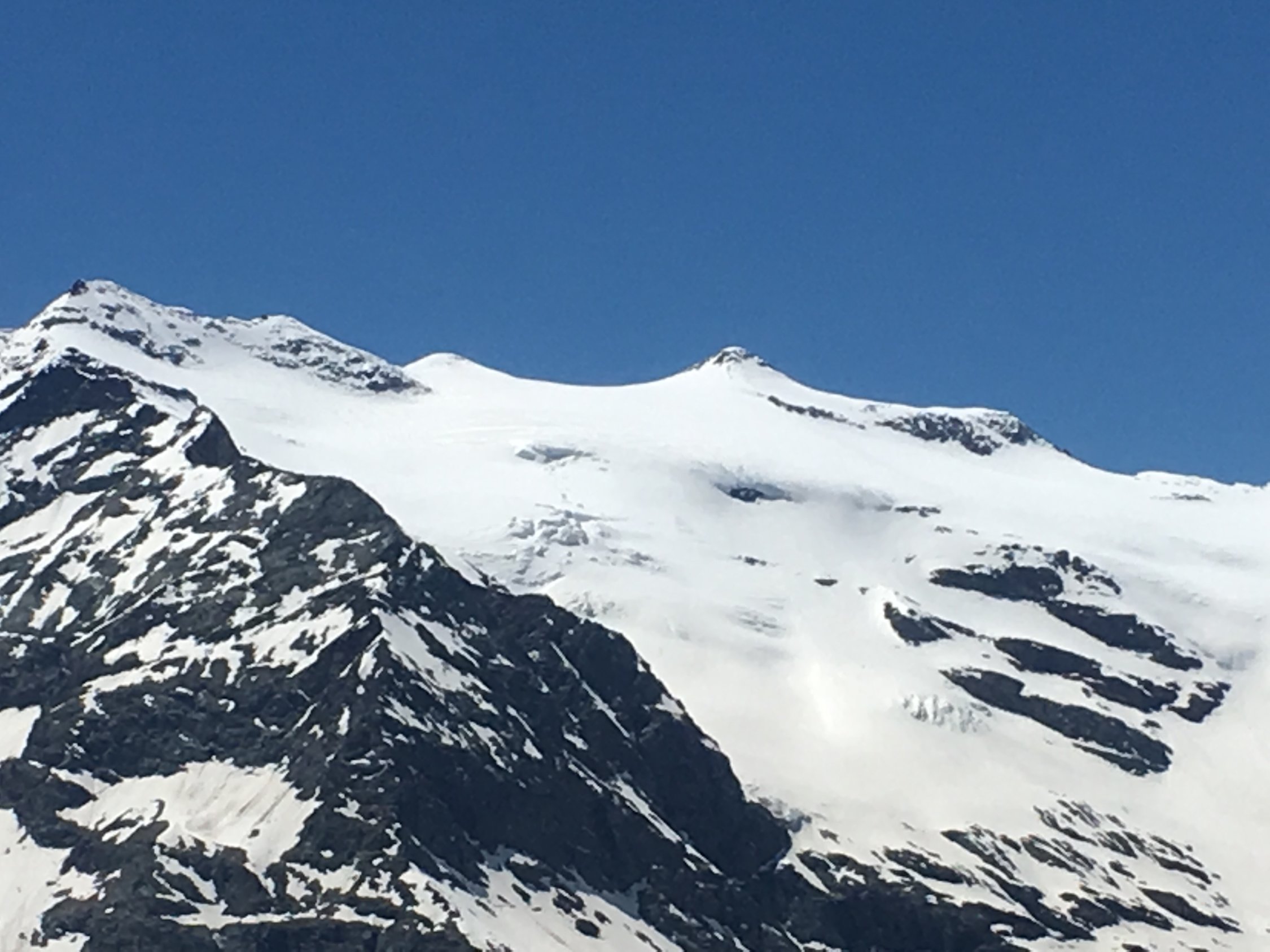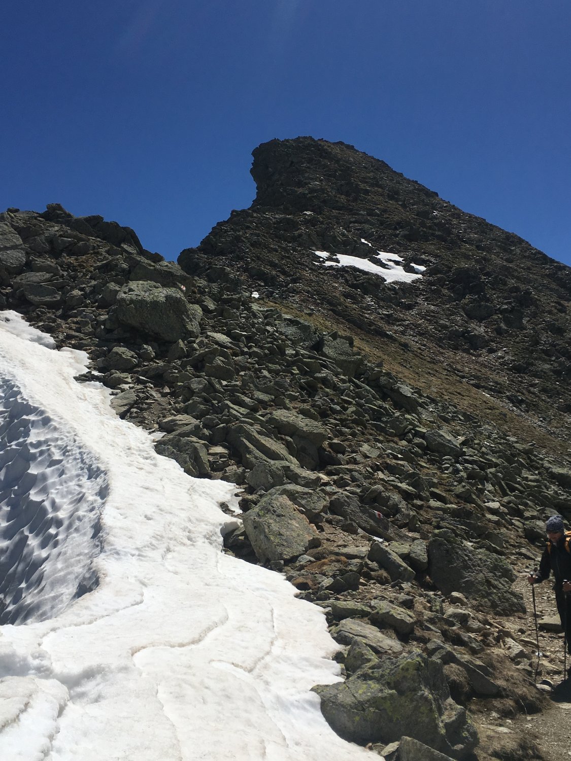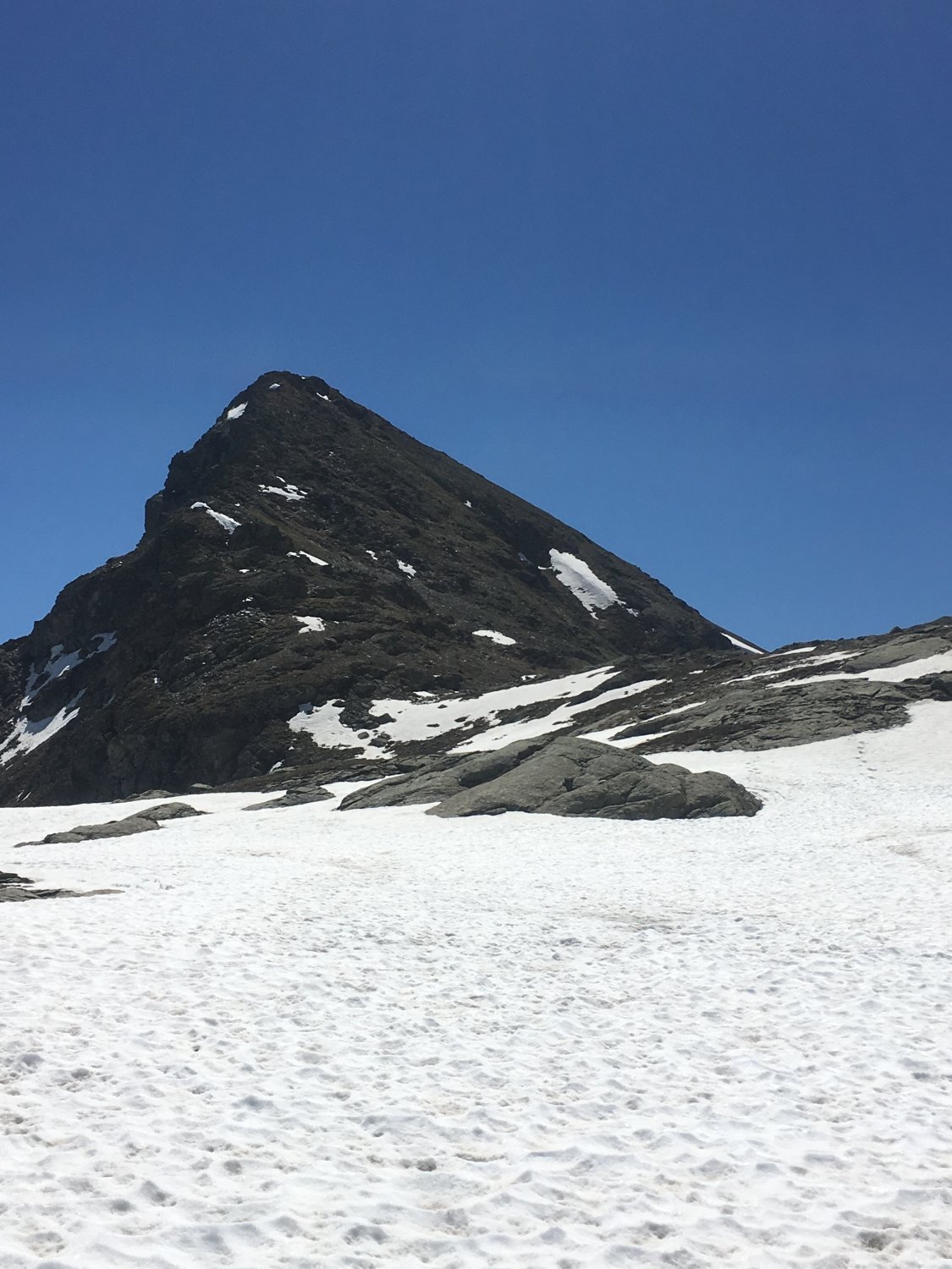 Start um 10 Uhr Parkplatz oberhalb Ospizia Bernina, 10 Grad, starker Südwind. Bis P. 2416 noch viele Schneefelder, aber meist hart und mit etwas Spürsinn findet man die richtige Route, Wanderweg nur teilweise erkennbar. Ab Höhe 2400 m nur noch einmal Schnee auf Höhe 2475, kann aber umgangen werden, steil. Nun alles dem schönen Wanderweg in der Südwestflanke bis zur Südflanke und unschwer zum breiten Gipfel.