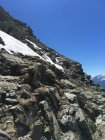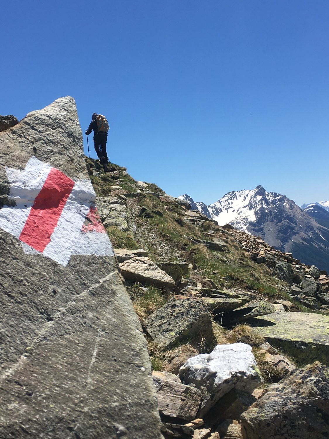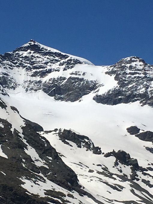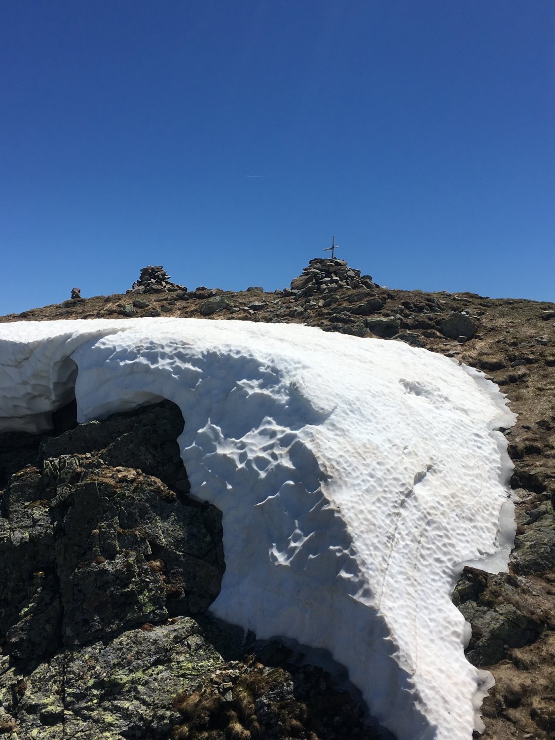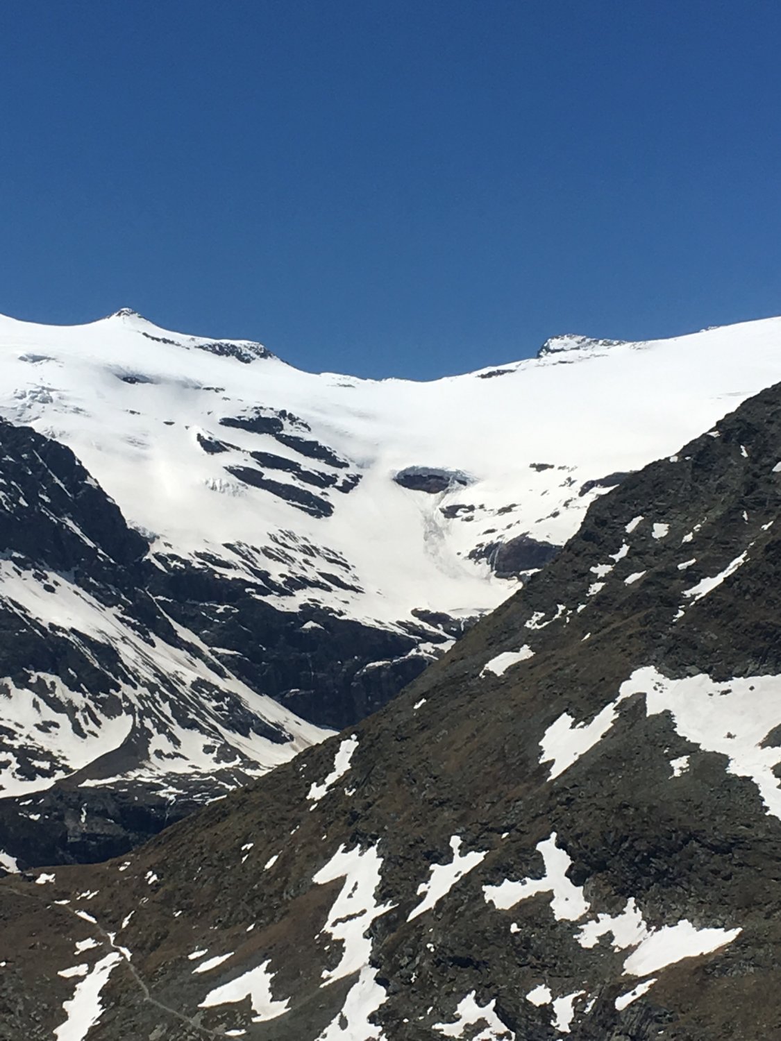 Start um 10 Uhr Parkplatz oberhalb Ospizia Bernina, 10 Grad, starker Südwind. Bis P. 2416 noch viele Schneefelder, aber meist hart und mit etwas Spürsinn findet man die richtige Route, Wanderweg nur teilweise erkennbar. Ab Höhe 2400 m nur noch einmal Schnee auf Höhe 2475, kann aber umgangen werden, steil. Nun alles dem schönen Wanderweg in der Südwestflanke bis zur Südflanke und unschwer zum breiten Gipfel.