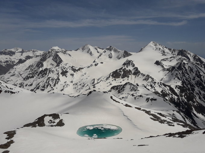 Bester Sommerfirn. Weg zur Martin Busch Hütte ist teilweise noch durch Lawinen verlegt. Daher Anfahrt mit dem MTB etwas mühsam. Schnee reicht bis 100m vor die Hütte.