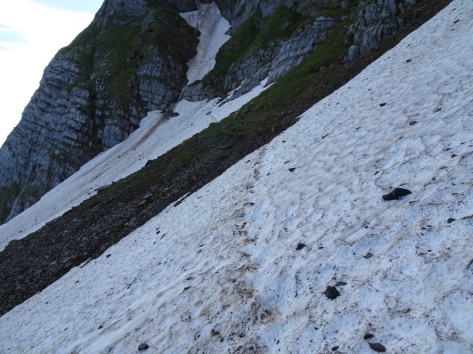 Die üblichen Frühjahrs-Schneefelder auf der Route. Einstieg bei der Muusfallen, Querung unter der Langwand und weiter bis zur Tierwis; Langwand hat auch teils apere Stellen. Vom Ellbogen bis zur Querung vor der Tierwis kann die Rinne benutzt werden, oder auch (aper) auf dem Bergweg gegangen werden.