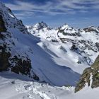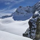 In der Scharte ist ein wunderbarer Blick auf den Schattenspitzgletscher. Die Spalten sind recht gut zugeschneit.