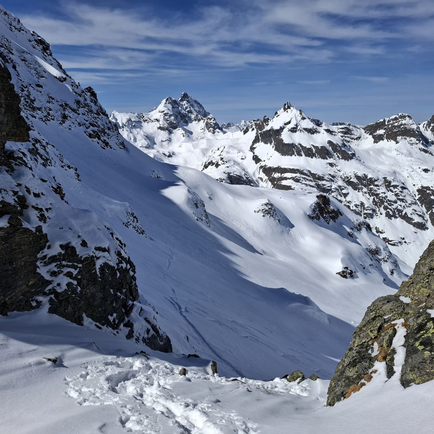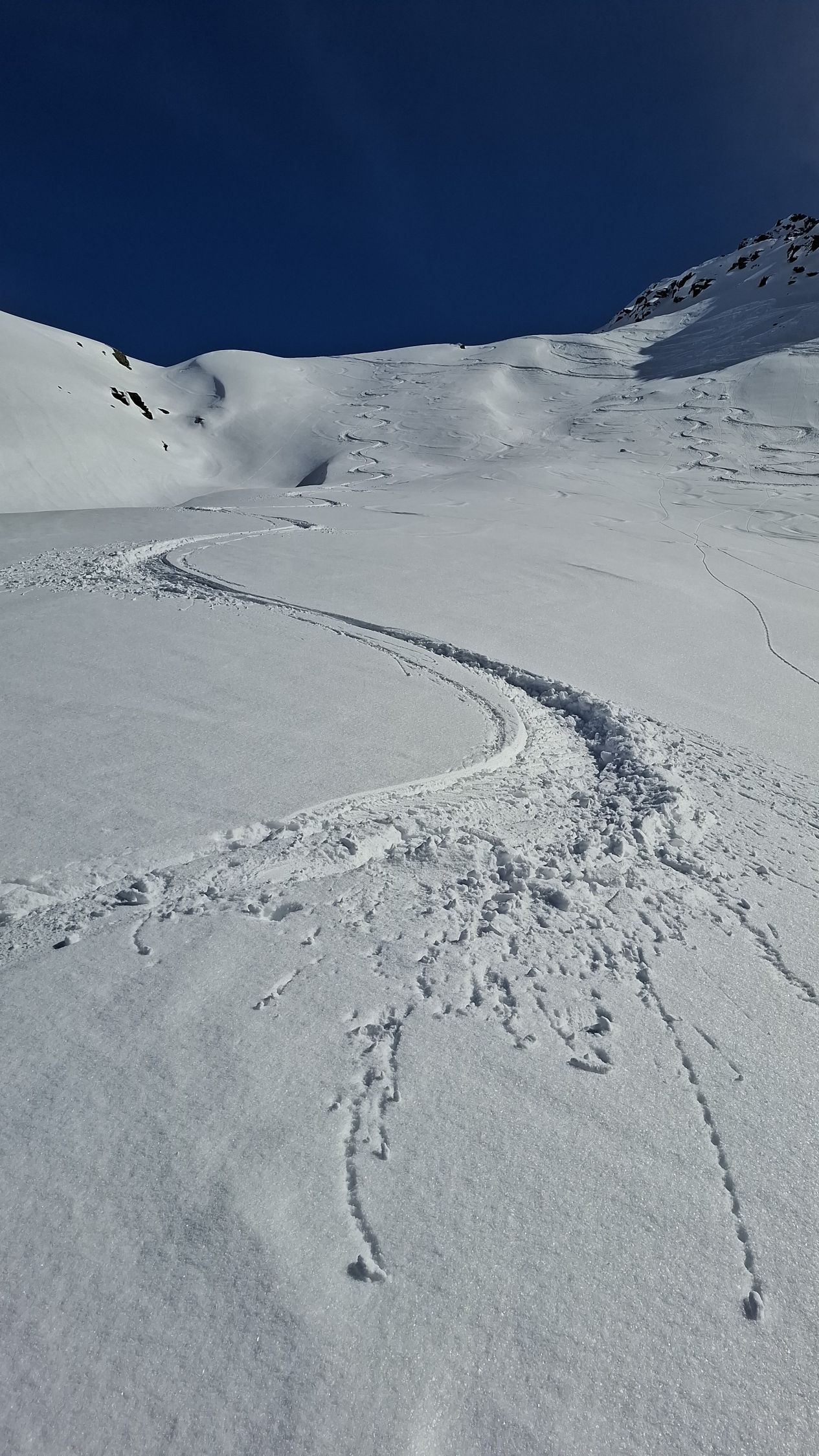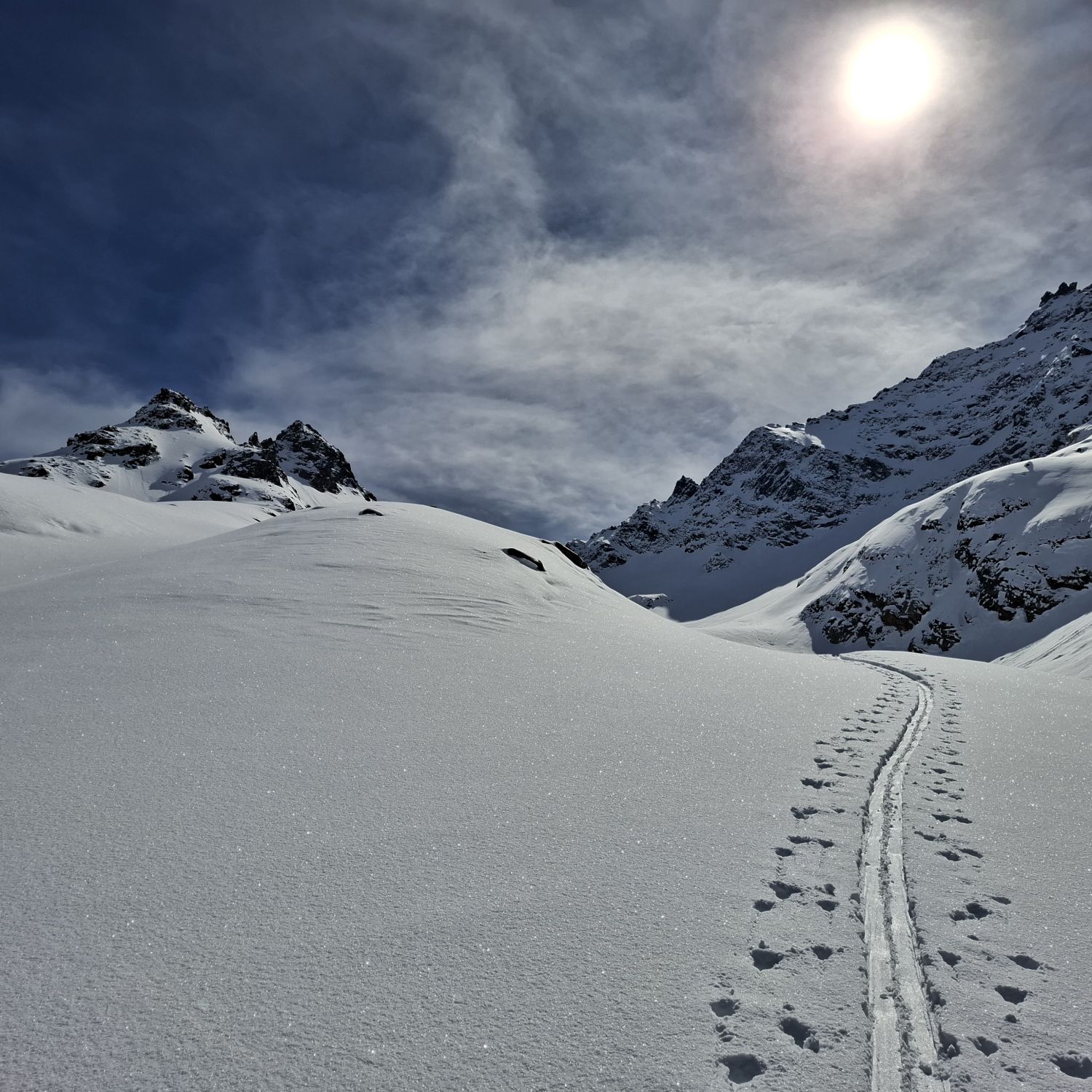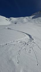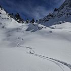 In feiner Spur aufgestiegen. Auf Höhe ca. 2400 teilten sich die Wege. Man kann auch weiter zur Einsattelung zur kleinen Schattenspitze gehen, ich bevorzugte die Kl. Egghörner, respektive bis zur Scharte Skidepot.