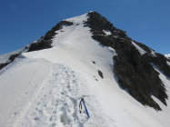 Um 07.30 von der Furkastrasse gestartet. Der Weg zum Furkabahn Tunnel ist nicht befahrbar, ein Versuch ist gescheitert. Gute Unterlage bis zum Skidepot. Der Steilhang ist mit Steigeisen gut machbar. Für den Gipfel Stöcke mitnehmen, da der Schnee weich und tief ist. Bickel nur für den Steilhang geeignet.