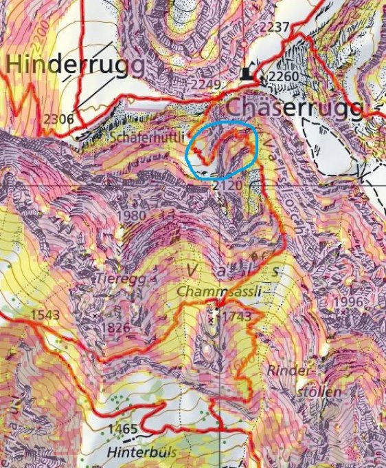 Bei der zweitletzten Querung im Valsertal auf 2100m liegt noch viel Schnee. Mit Steigeisen und Pickel wahrscheinlich gut machbar. Nur mit Bergschuhen ausgerüstet und allein war mir das Risiko zu hoch.