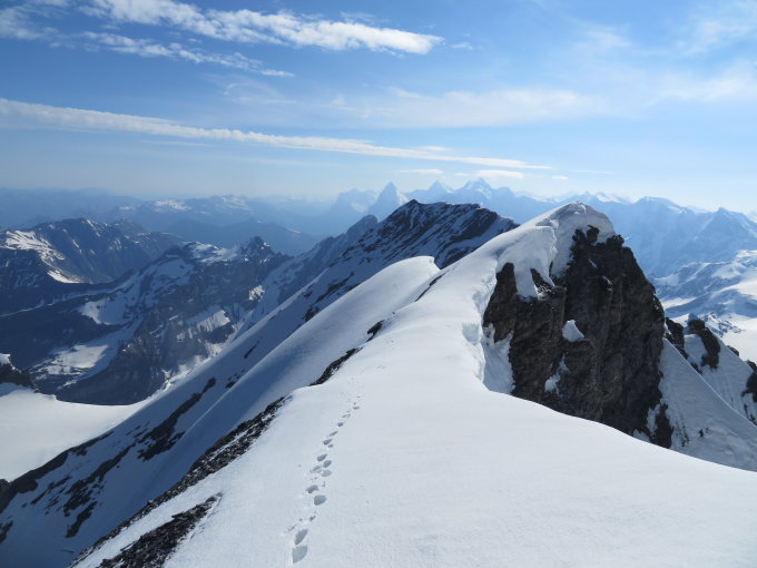Der Abstieg im geht im oberen Teil sehr gut. Toller Firn. Bei der Felspassage haben wir die Steigeisen ausgezogen.