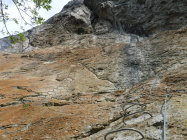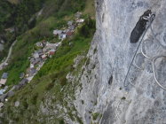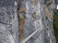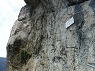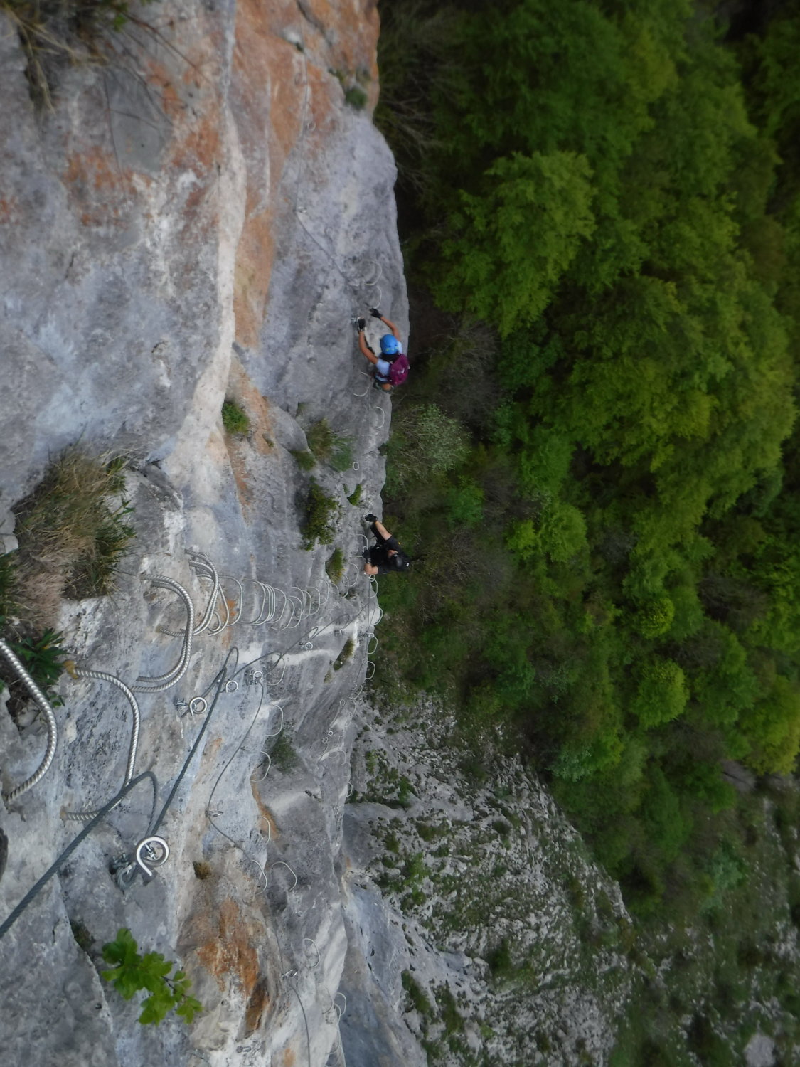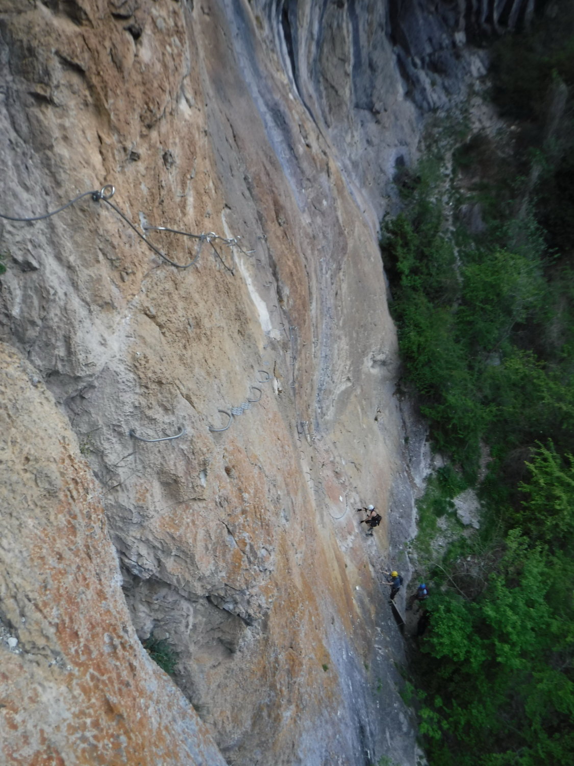 Die beiden Klettersteige waren gesperrt vom 15.12.2018 bis 31.3.2019 per ausgehängter Anordnung beim Wegabzweig vor dem ersten Haus. 2 französische KS-Pärchen meisterten zügig die schwere Variante zuerst und gingen nach dem Abstieg bis zum Pfahl die andere Variante dann an, wo sie einer mit seiner Drohne filmte.
