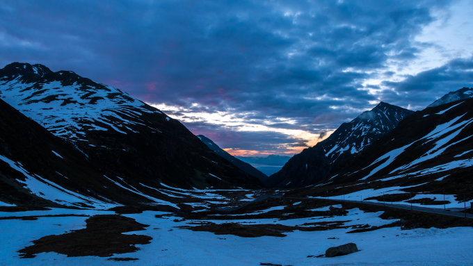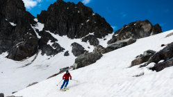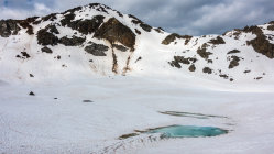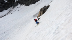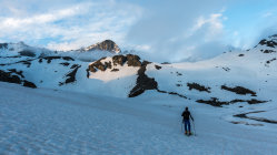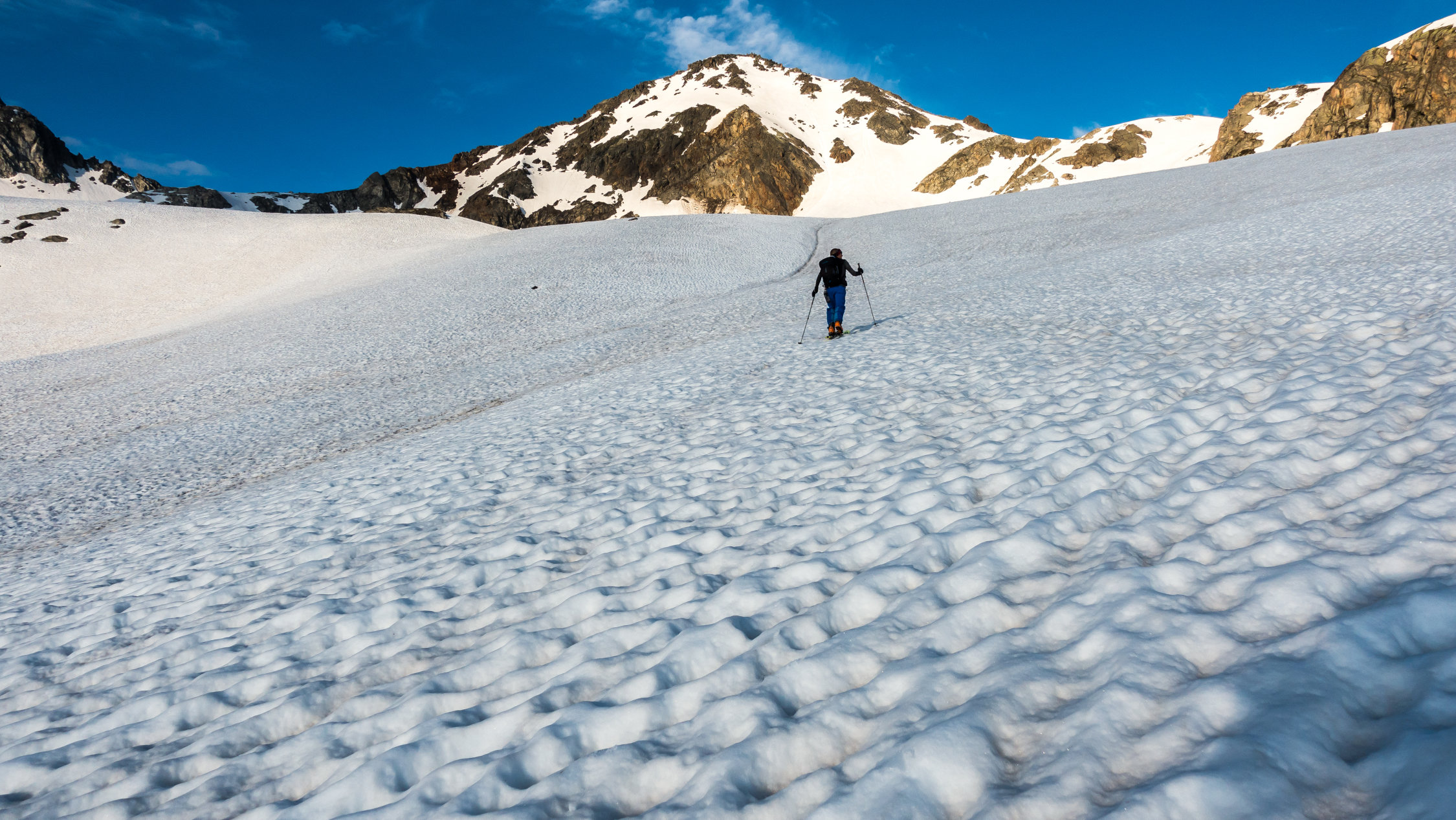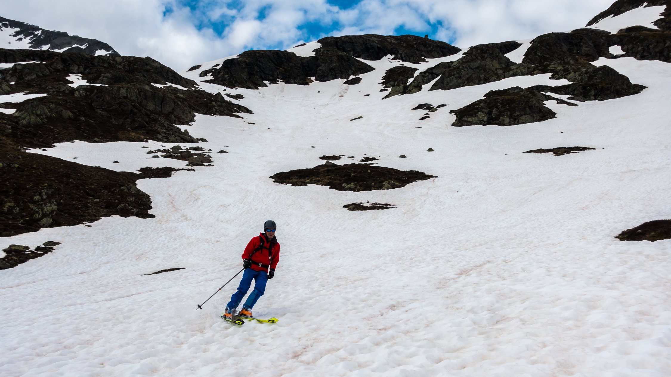 Start an der Passstrasse um 5.30 Uhr, 5°, windstill, Wolkenfelder und ein paar Nebelfetzen. Wunderschöne Morgenstimmung. Später meist sonnig. Ski direkt vom Parkplatz an der Strasse anziehen und auf feuchtem, aber kompaktem Sommerschnee die erste Steilstufe hoch. Danach bis unter den Gipfelhang gefrorene Schneedecke. Gipfelhang griffig und problemlos mit Ski bis zum Gipfel. Die gesamte Schneedecke gleicht einem riesigen Emmentaler-Käse bzw. sieht so aus als ob ein paar Tausend Kühe darüber gelaufen wären. Trotzdem erstaunlich gut zu fahren, wenn man wartet bis es weich wird. Wir sind um 8.30 vom Gipfel abgefahren, ab Mitte super, oben wäre ca. 1 Stunde später wohl noch besser gewesen.