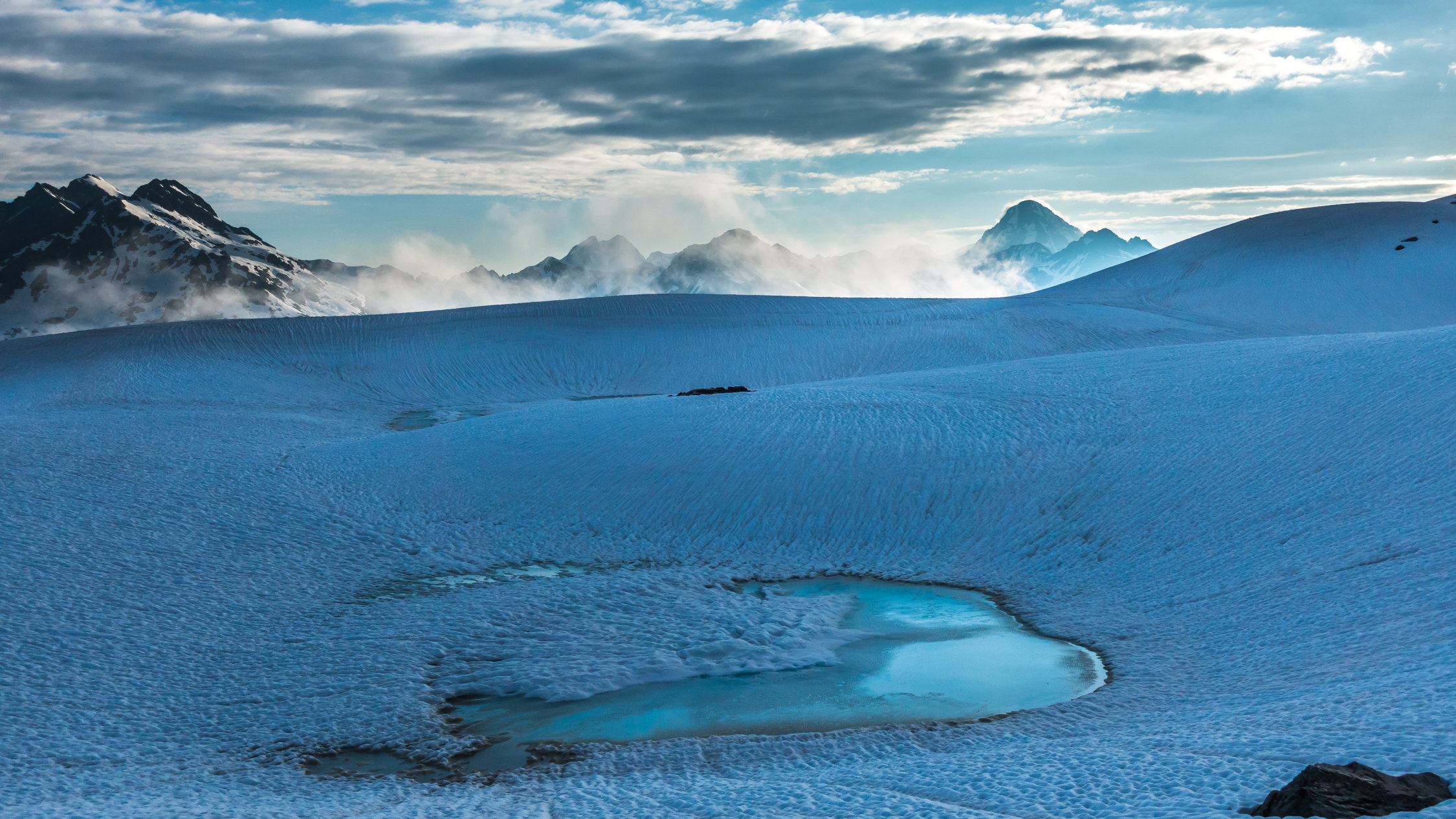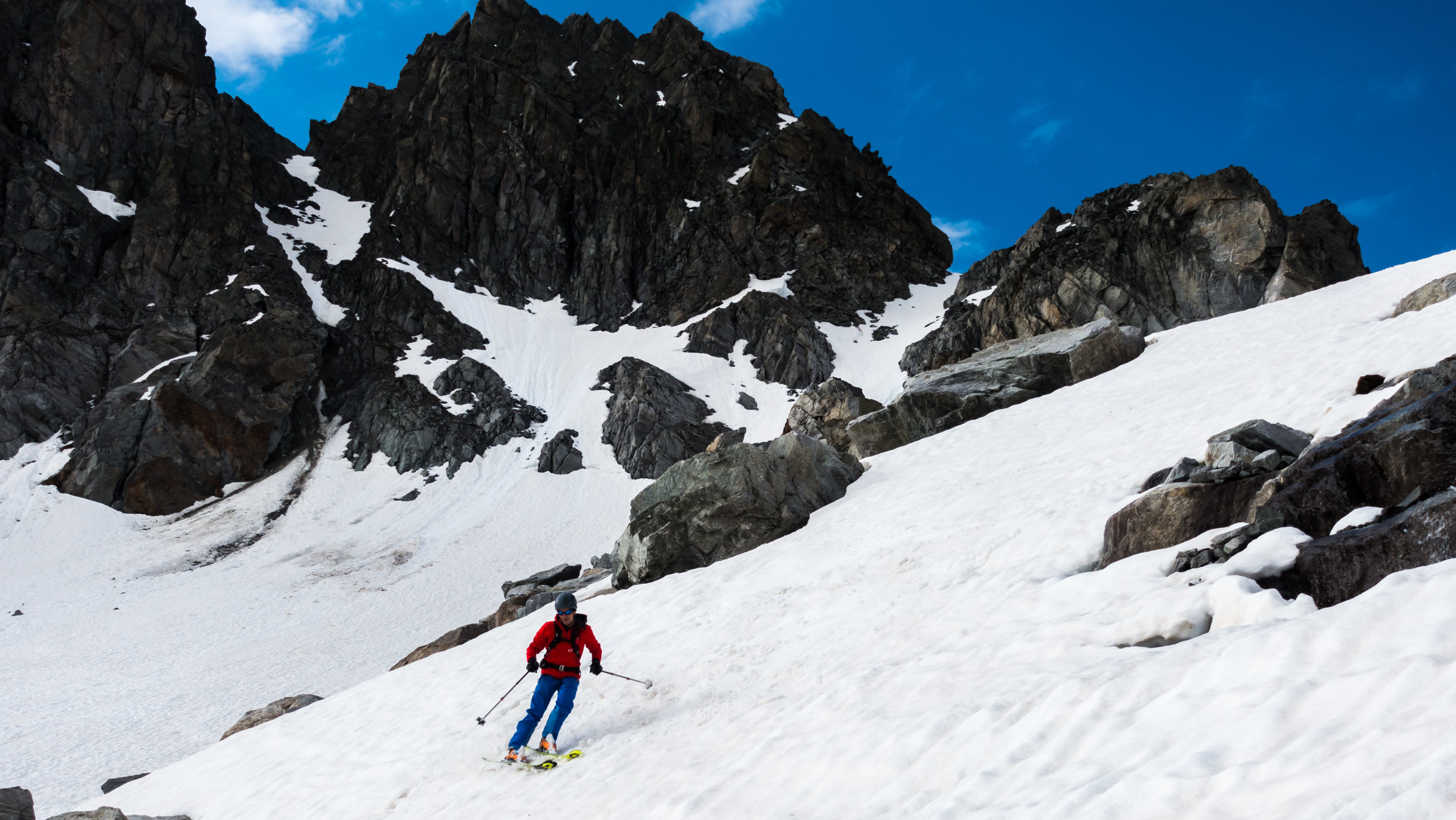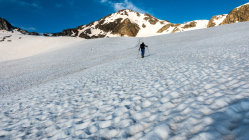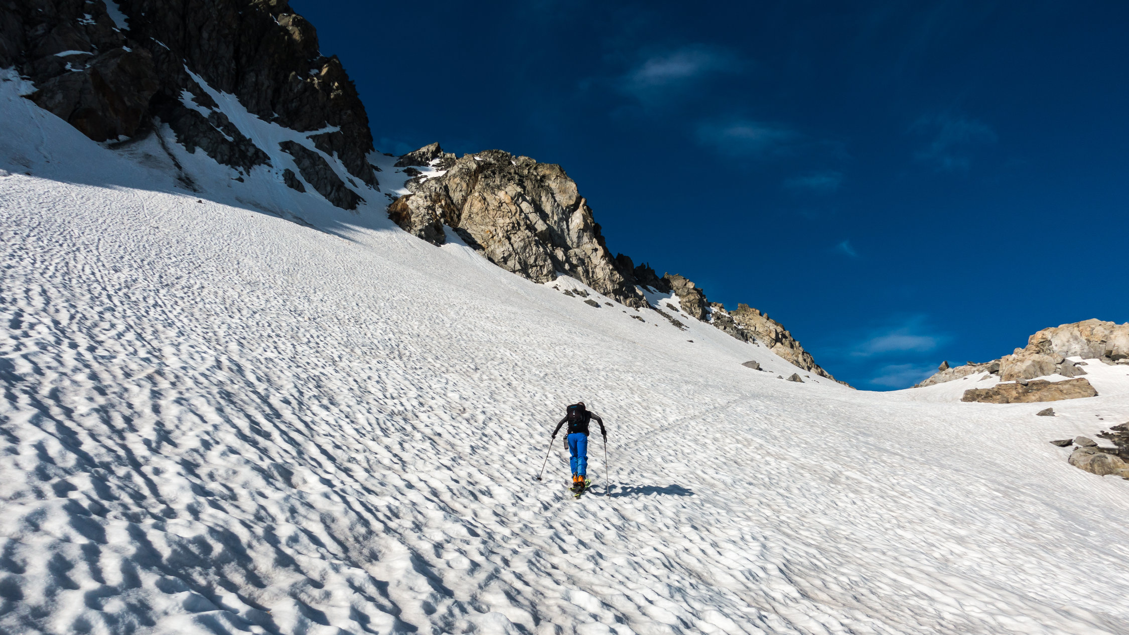 Start an der Passstrasse um 5.30 Uhr, 5°, windstill, Wolkenfelder und ein paar Nebelfetzen. Wunderschöne Morgenstimmung. Später meist sonnig. Ski direkt vom Parkplatz an der Strasse anziehen und auf feuchtem, aber kompaktem Sommerschnee die erste Steilstufe hoch. Danach bis unter den Gipfelhang gefrorene Schneedecke. Gipfelhang griffig und problemlos mit Ski bis zum Gipfel. Die gesamte Schneedecke gleicht einem riesigen Emmentaler-Käse bzw. sieht so aus als ob ein paar Tausend Kühe darüber gelaufen wären. Trotzdem erstaunlich gut zu fahren, wenn man wartet bis es weich wird. Wir sind um 8.30 vom Gipfel abgefahren, ab Mitte super, oben wäre ca. 1 Stunde später wohl noch besser gewesen.