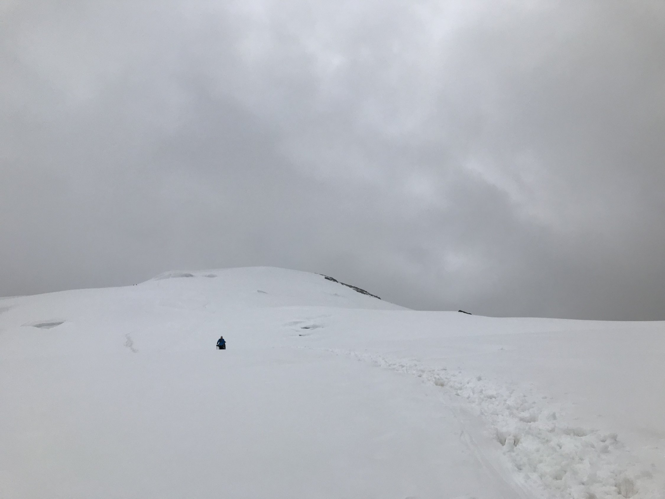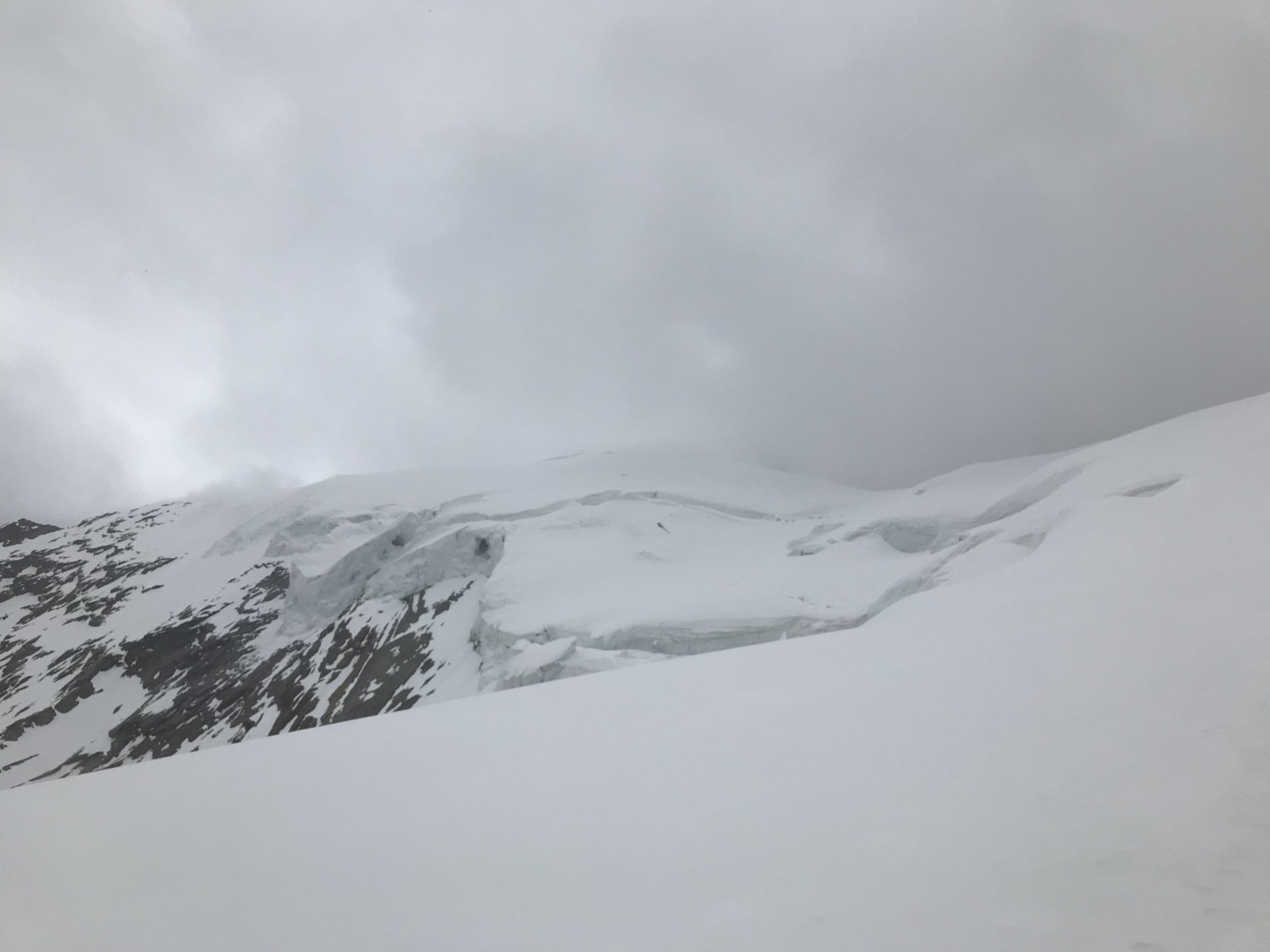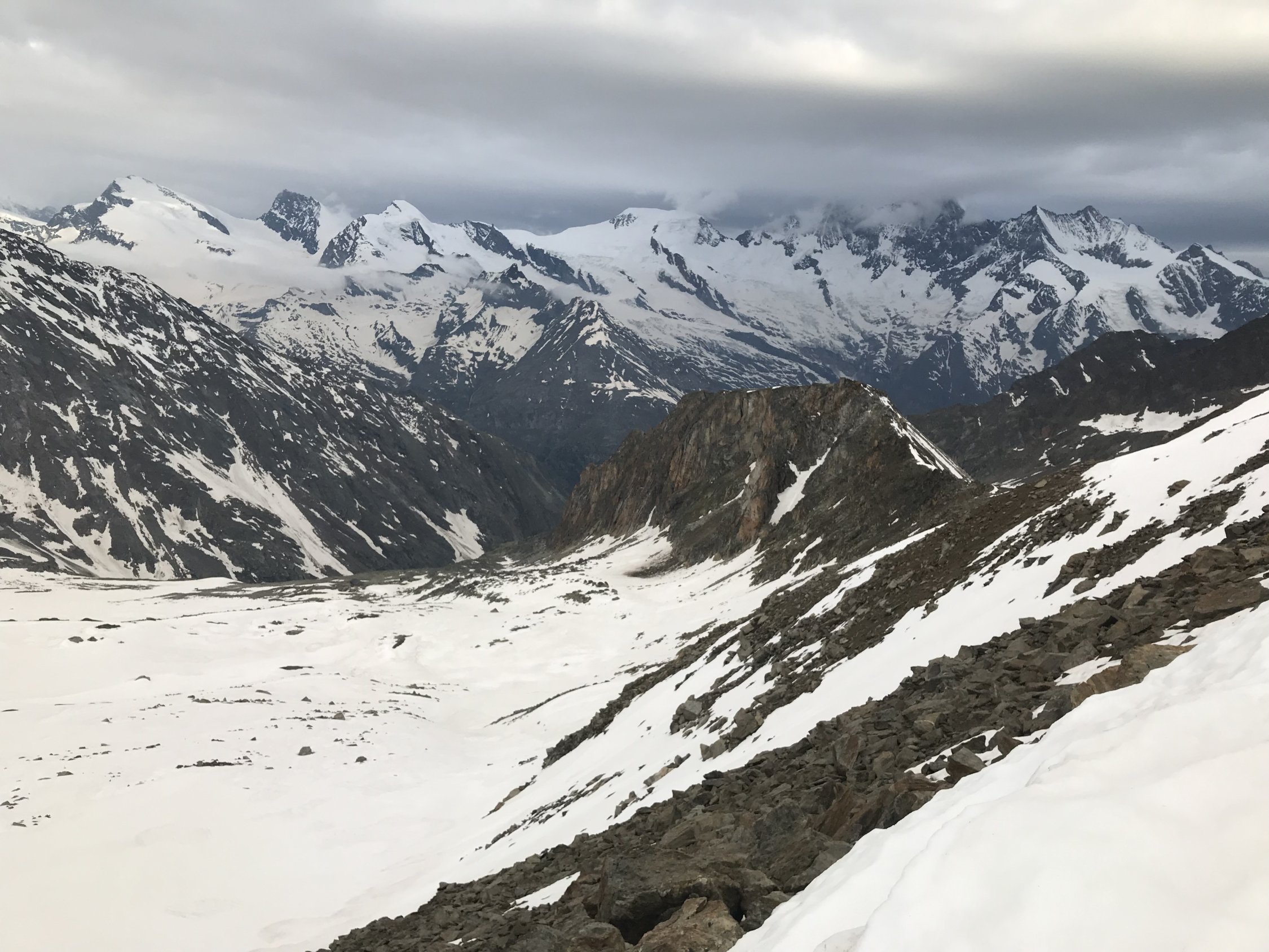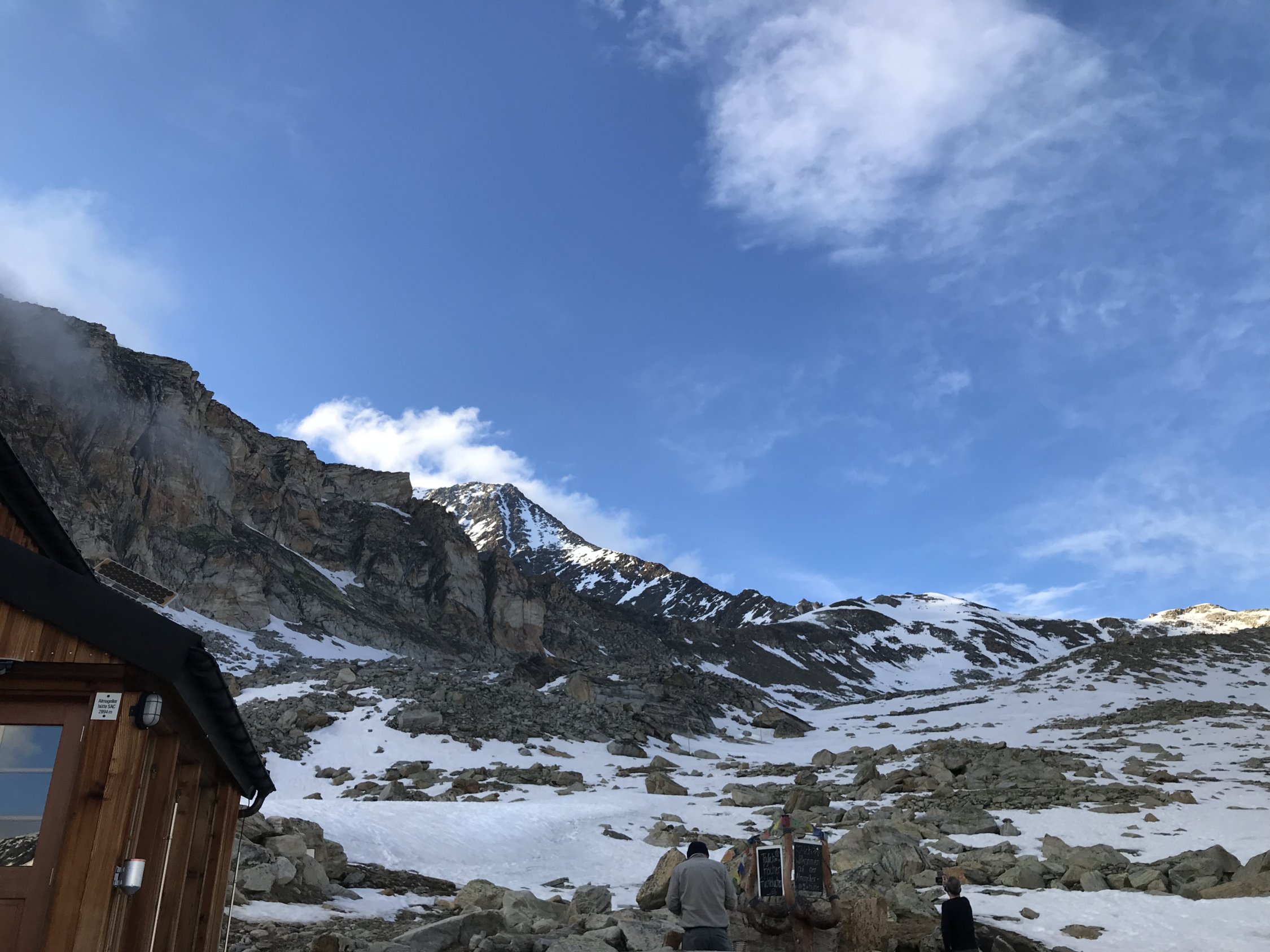 Gestartet haben wir die Tour um 4:30. Der Schnee war schon ab der Allmagellerhütte weich und man sank z.T. bis zur Hüfte ein. Daraufhin folgten wir den freigelegten Felsbänder um möglichst wenig Schneefelder zu queren. Den Zwischenbergenpass erreichten wir nach 1,5h um 6:00. Ab dem Pass folgten wir dem Grat um den Aufstieg zu vereinfachen. Leider keine Aussicht auf dem Gipfel, dafür alleingängige Bergsteiger. Die Route ab Weissmies nach Hohsaas wurde neu angelegt und dadurch entschärft.