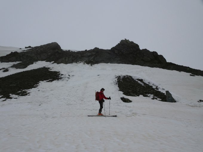 Wir sind vom Gipfel nordwestseitig abgestiegen (kurz, aber sehr bröselig) und dann über den Nordwestrücken wieder auf die Aufstiegroute abgefahren. Die steile Nordabfahrt war uns heute bei unsicherem Wetter und später Abfahrtszeit zu kritisch. Abfahrt (ca. 10.00 h) in steileren Passagen schon sehr sulzig, in flacheren perfekt, da der Riffelschnee schön weich und gleichmässig zu fahren war.