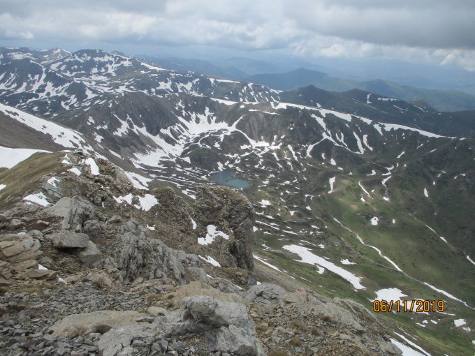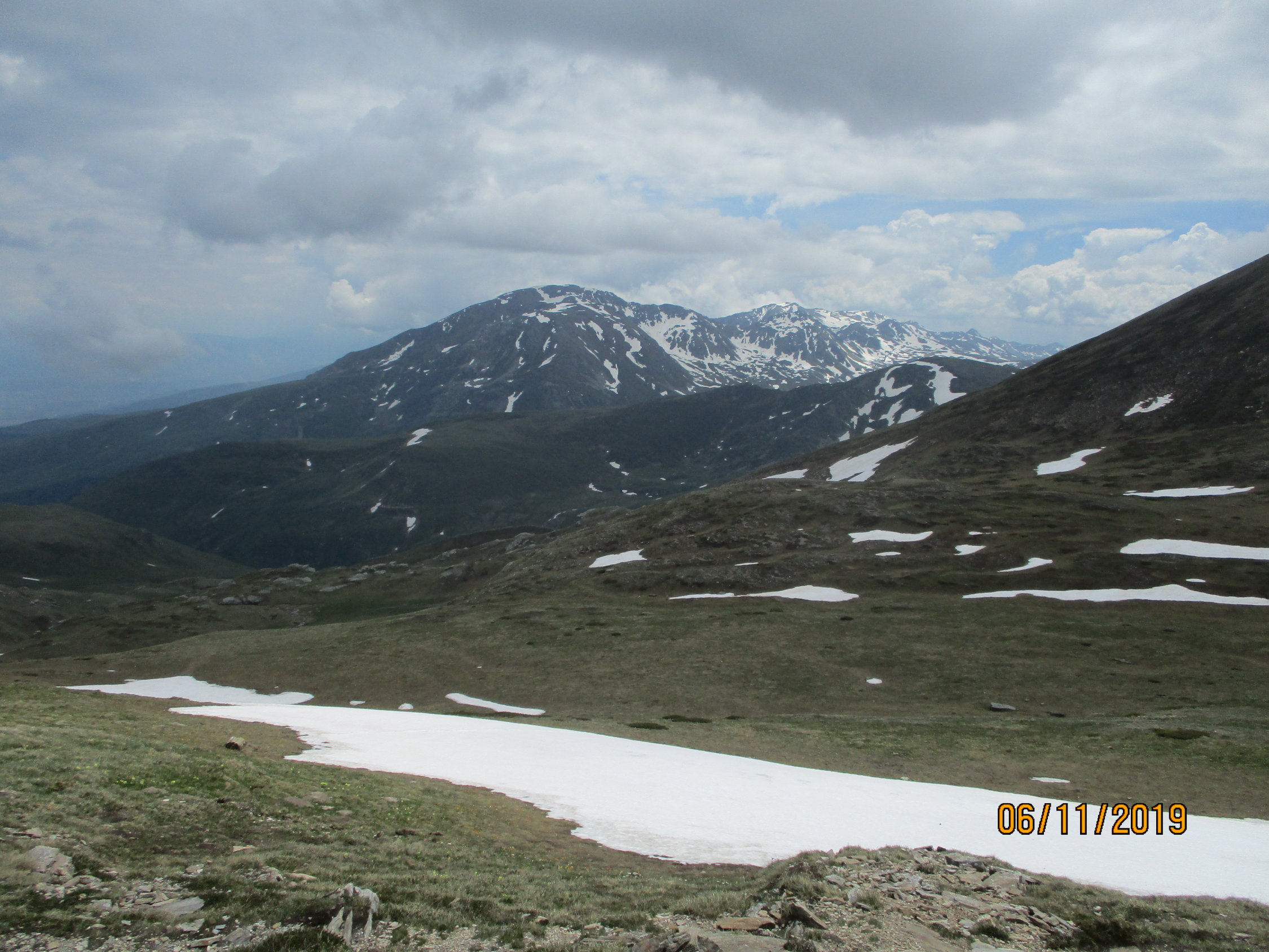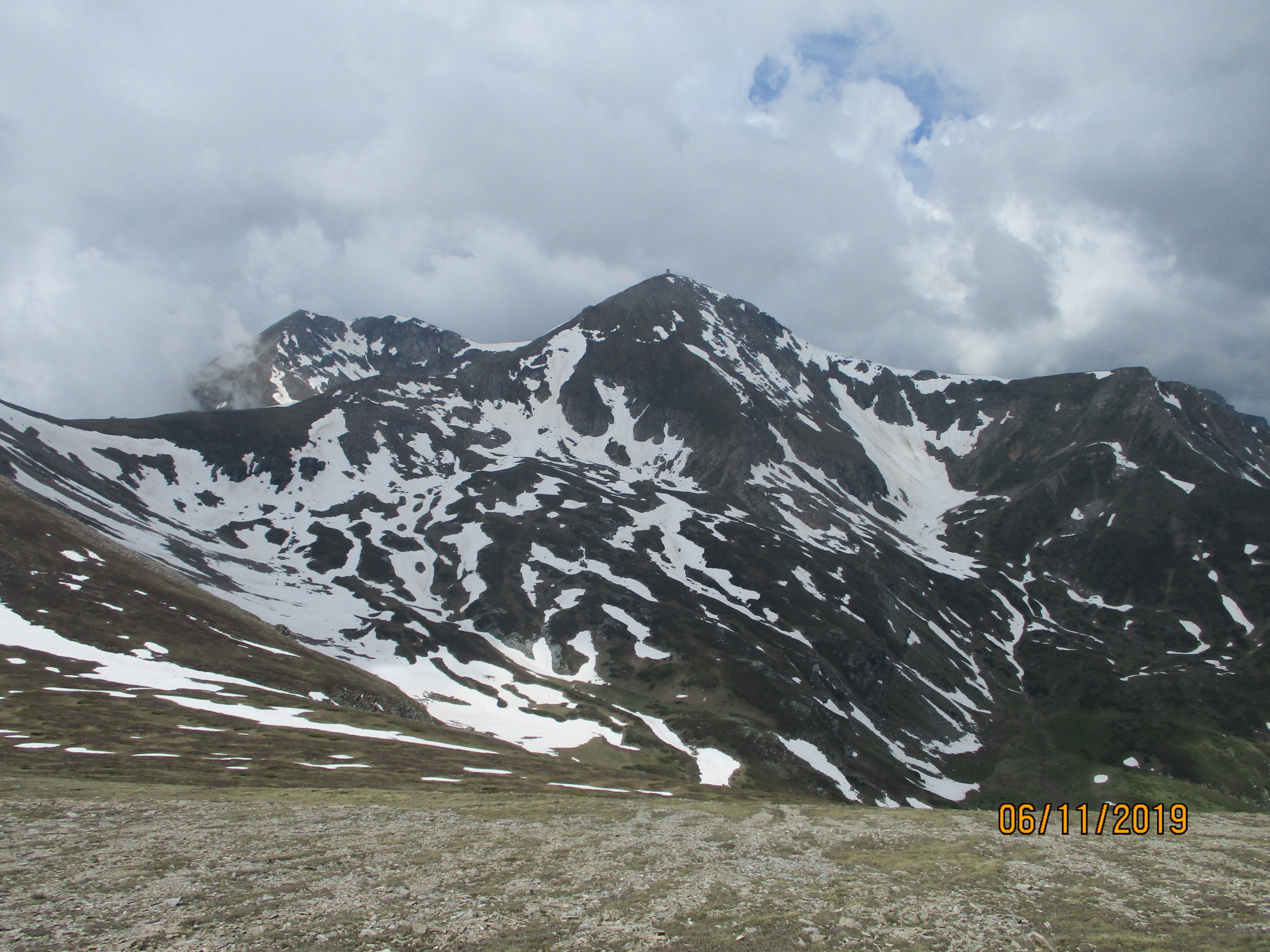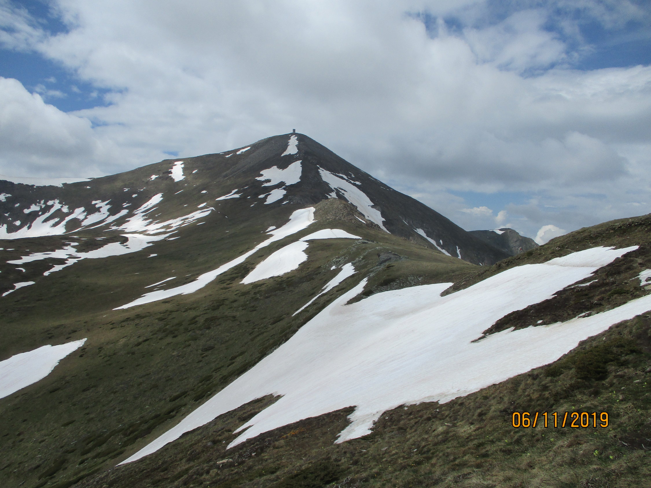 Hätte ich es dem polnischen Pärchen gleichgetan, die bereits um 5 Uhr morgens aufgebrochen waren, hätte ich einen Bergtag mit überwiegend wolkenfreien Verhältnissen erlebt. Bei mir zog immer wieder abkühlendes Gewölk herein, dennoch hatte auch ich Glück mit der Gipfelpanorama, welches Aussichten über nahezu den gesamten Sar-Planina-Grenzkamm zwischen Mazedonien und Kosovo, als auch Blicke über die Ebene von Tetovo und Gostivar hinweg gewährt. Keine Niederschläge, kein Gewitter. Die wenigen zu querenden Schneefelder waren durchwegs harmlos, der verdichtete Schnee trug gut.
